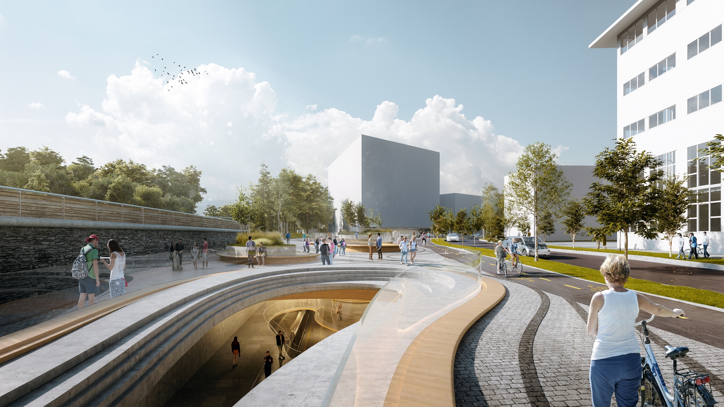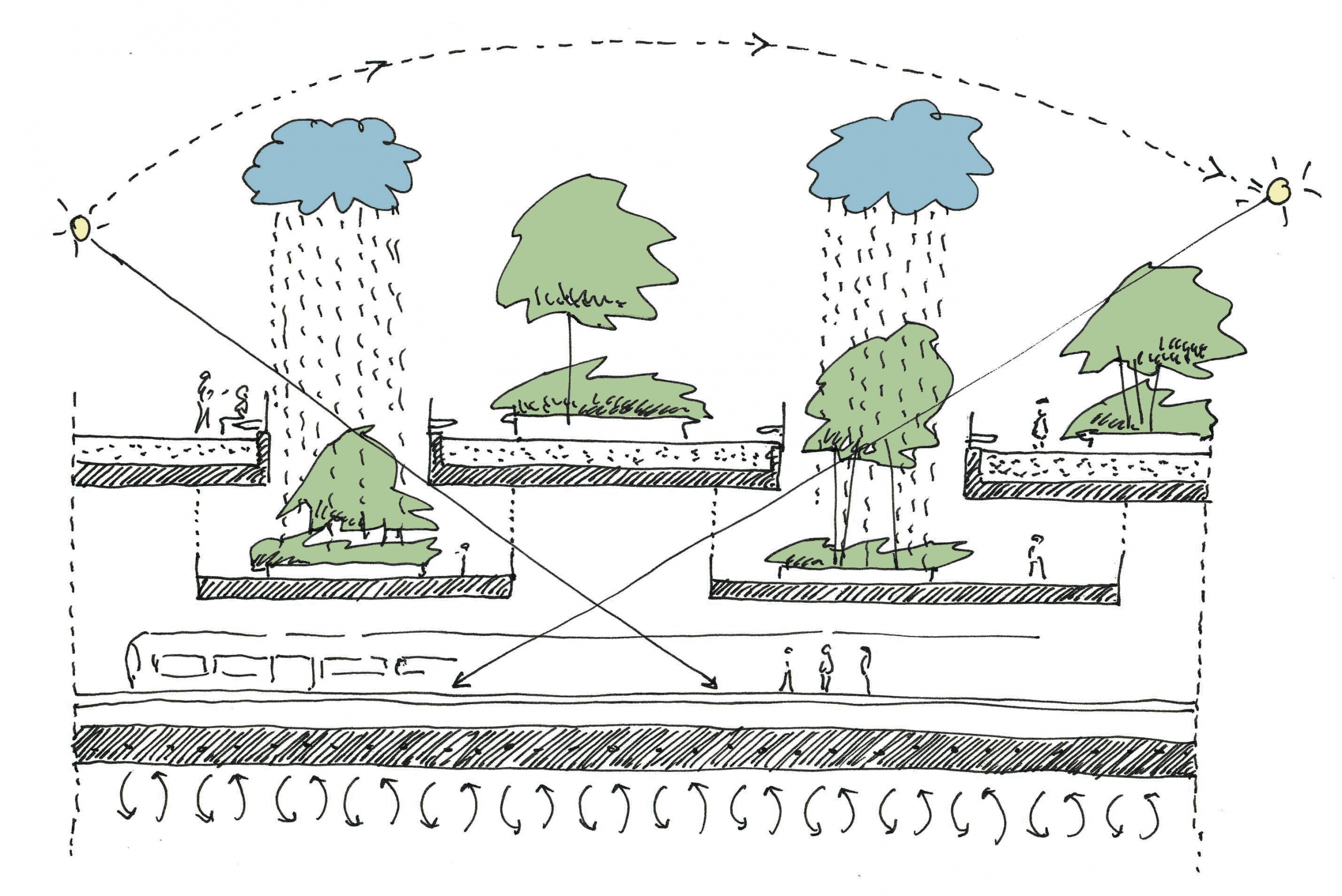 Aggodalomra semmi ok, a tervezők minden áttörés helyét pontosan kiszámolták, így az eső szigorúan csakis a növényeket éri, a peronok védve maradnak. De nemcsak az eső, a napfény is mindenhová bekúszik majd. Homályló északi fényével különösen reggel és az esti órákban tölti meg a tereket, a betontengerből átvisz minket az erdőbe.