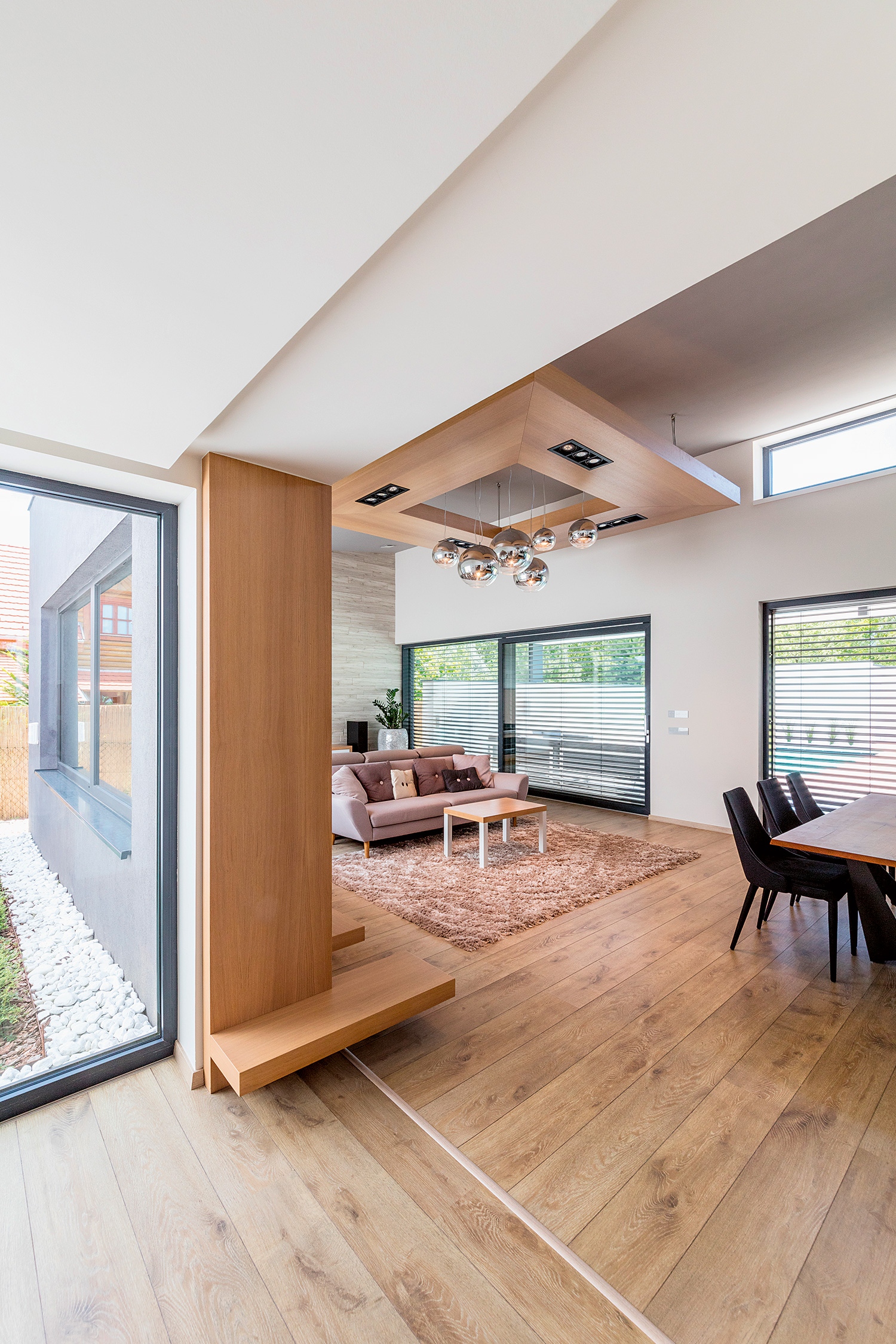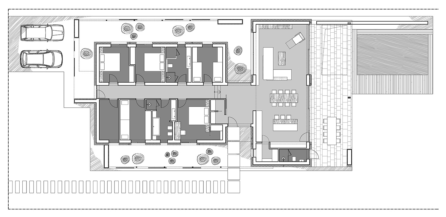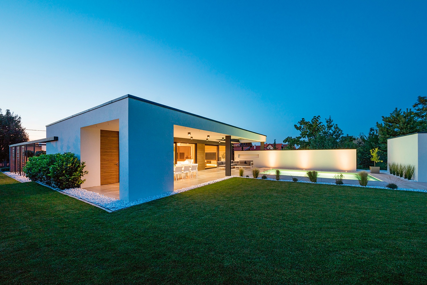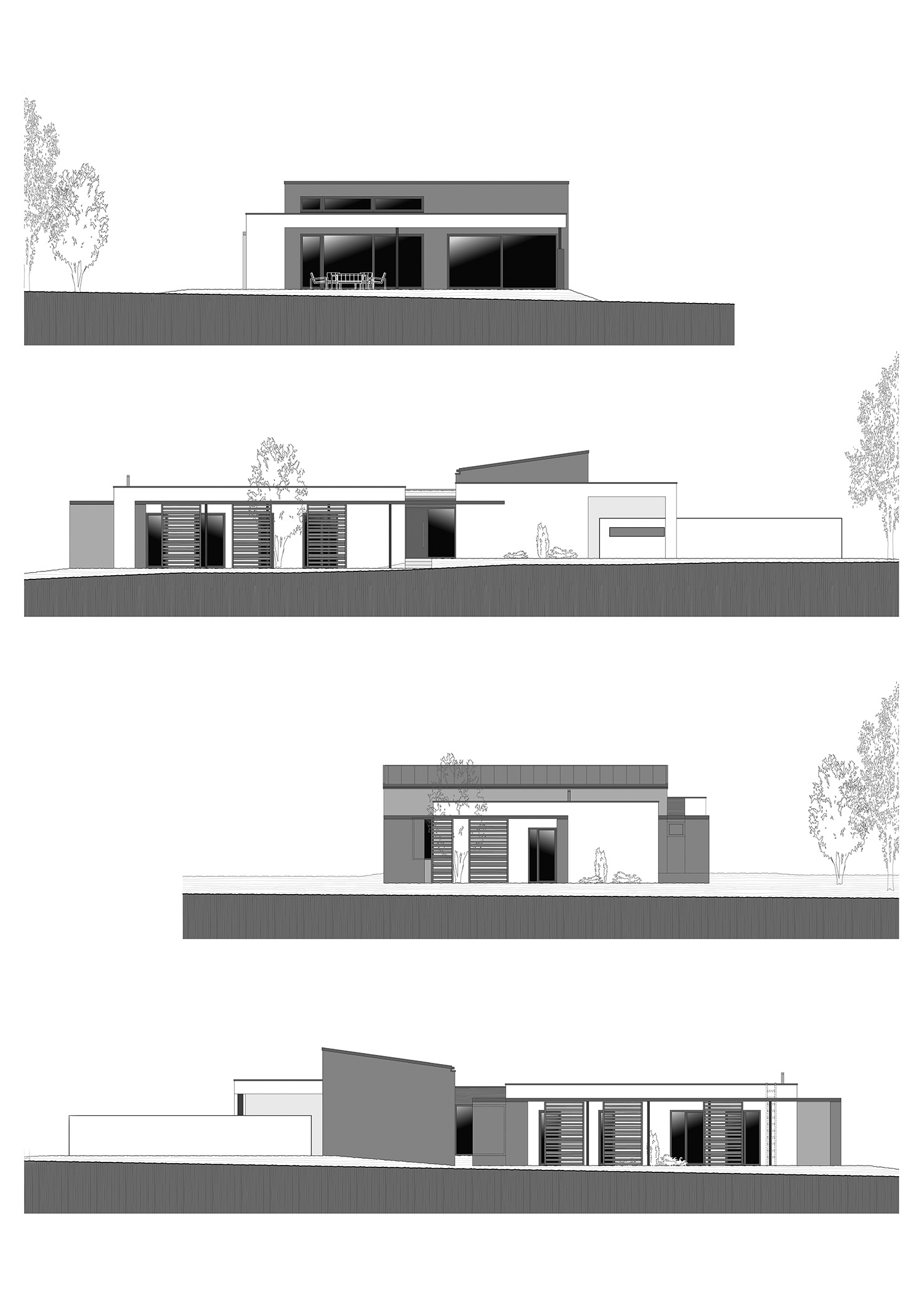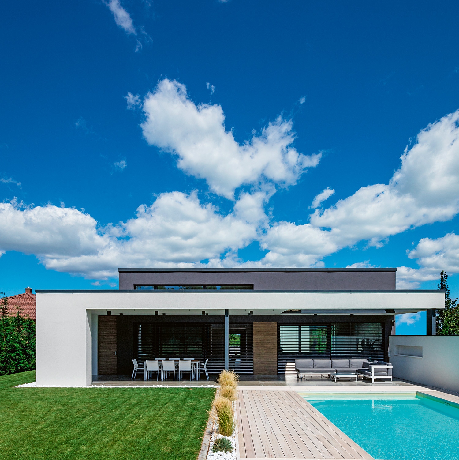 Ez a déli parti, frissen elkészült nyaraló is jól illeszkedik az iroda tervezői értékszemléletébe. Szinte szertartásosan kemény, zárt utcai homlokzat fogadja az érkezőt, hogy végül az oldalkertből egy olyan pontra kerüljön a bejárati ajtó, ami a földszintes épület két fő tömegének kapcsolódási pontjának tekinthető. A kerttel-napozóterasszal-medencével érintkező, nagyszabású, dupla belmagasságú nappali-étkező-konyha tömegére merőleges létre, és ahová sávablakos „felülvilágító” is került. Így a természetes fény nem pusztán a napozóterasz felől, az eltolható üveg függönyfalon keresztül jut a nappaliba, hanem felülről is. Ezek az egymásból kihúzott kubusok időnként eltérő színezést is kapnak: a meghatározóan fehérre vakolt tömegből grafitszürke idom emelkedik ki. Több Tóth Project terven is látható ez a monokróm, kontrasztos színezés, ami képes a különféle síkok, tiszta formák egymáshoz képest létrejövő viszonyait értelmezni, láthatóvá tenni.