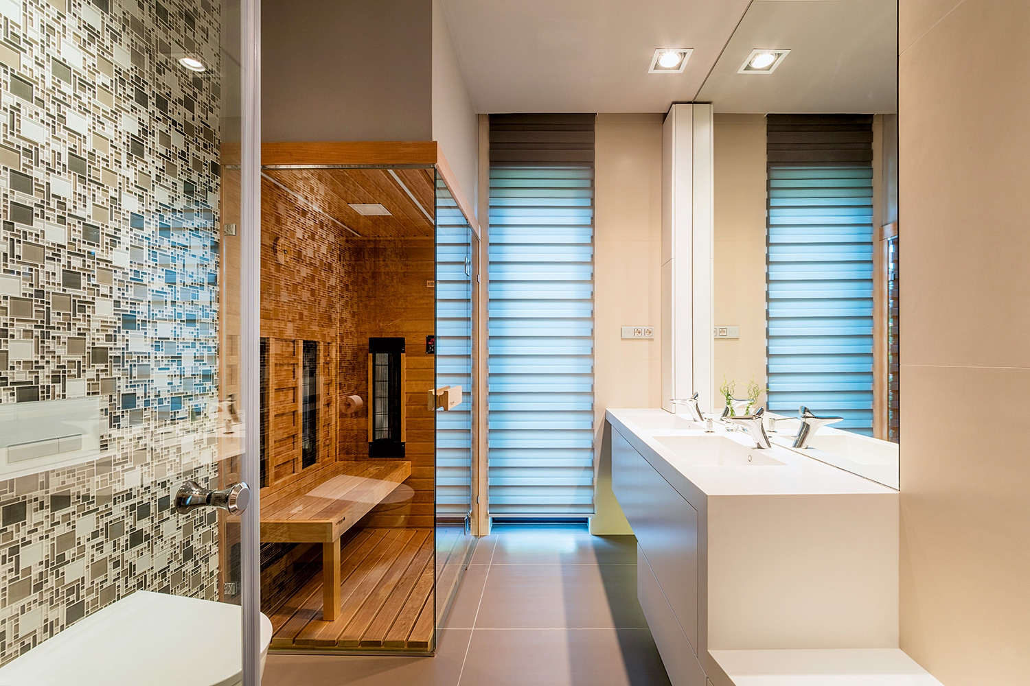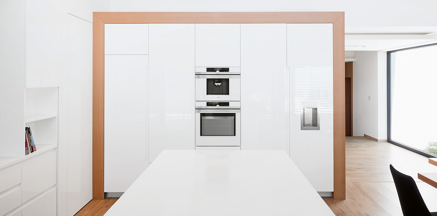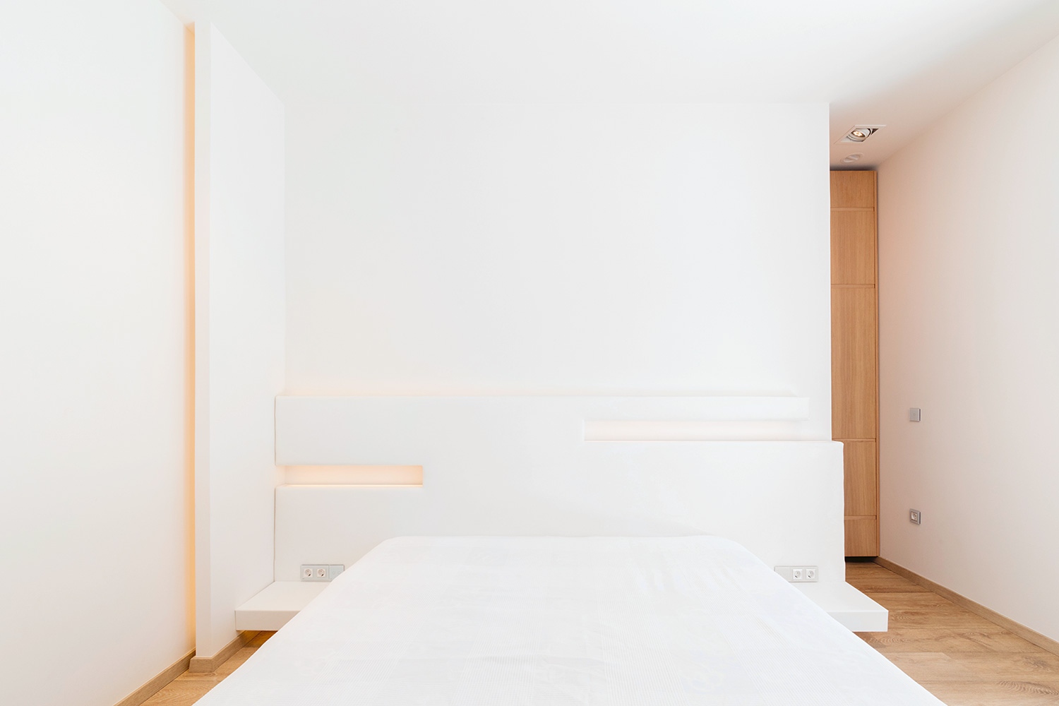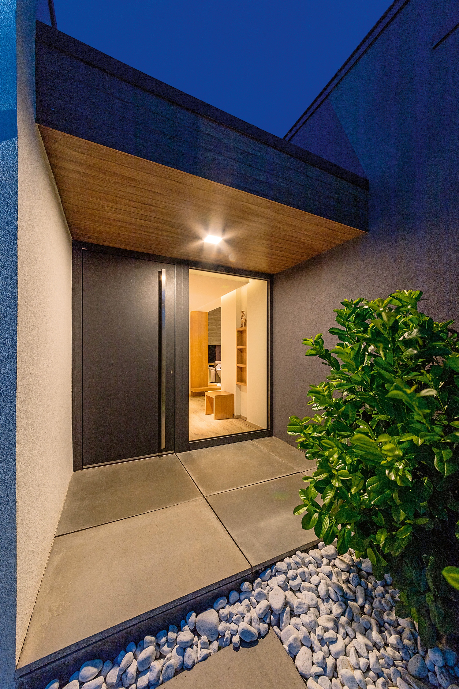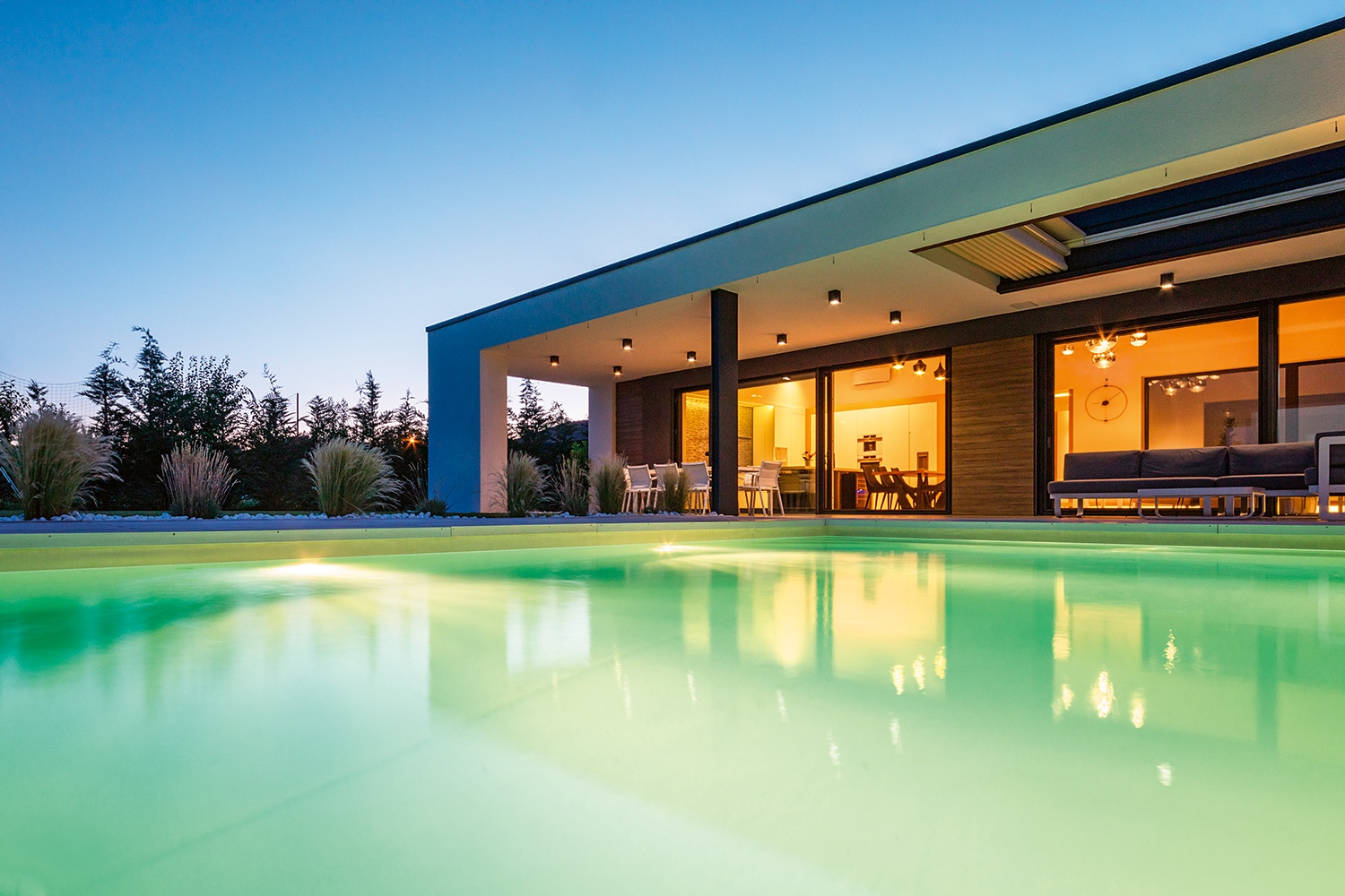 Ez a déli parti, frissen elkészült nyaraló is jól illeszkedik az iroda tervezői értékszemléletébe. Szinte szertartásosan kemény, zárt utcai homlokzat fogadja az érkezőt, hogy végül az oldalkertből egy olyan pontra kerüljön a bejárati ajtó, ami a földszintes épület két fő tömegének kapcsolódási pontjának tekinthető. A kerttel-napozóterasszal-medencével érintkező, nagyszabású, dupla belmagasságú nappali-étkező-konyha tömegére merőleges létre, és ahová sávablakos „felülvilágító” is került. Így a természetes fény nem pusztán a napozóterasz felől, az eltolható üveg függönyfalon keresztül jut a nappaliba, hanem felülről is. Ezek az egymásból kihúzott kubusok időnként eltérő színezést is kapnak: a meghatározóan fehérre vakolt tömegből grafitszürke idom emelkedik ki. Több Tóth Project terven is látható ez a monokróm, kontrasztos színezés, ami képes a különféle síkok, tiszta formák egymáshoz képest létrejövő viszonyait értelmezni, láthatóvá tenni.