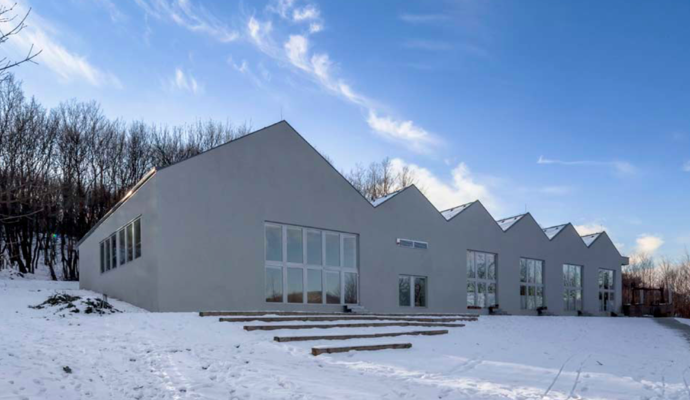 Hosszúkás, betonszürke épület, hatalmas ablakokkal, az öt rész (euritmia-színházterem, és négy osztály) öt csúcsos tetővel. Nagyon „nem Waldorf”! A telken felvezető út és a belépő, az előtér már megkapó. Itt valaki a legapróbb dolgokra is gondolt. Például, hogy a bejárati fal hatalmas egybe-üvegtábla legyen, ne osztott rácsos módon zárja el, hanem nyissa ki a világot. Benyitogatunk sorra az osztályokba.