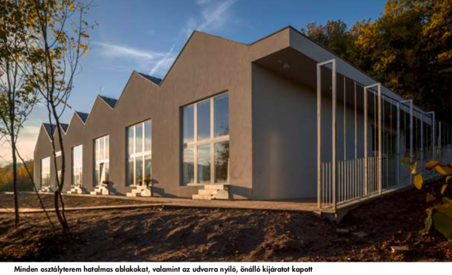 Megérkezünk az új pilisszentlászlói iskolarészhez – dombon áll, nyugatra a falutól. (Ugyanúgy, ahogy keletre a falutól egy dombon áll a nagy templom. Itt valaha kolostor volt. A török lerombolta. Aztán templom épült. Úgyszólván a falun kívül. De a falu elkezdett felkúszni a templom felé. Talán majd egyszer errefelé is kúszni kezd... Így látja és így reméli a tervező építész, Valkai Csaba.)