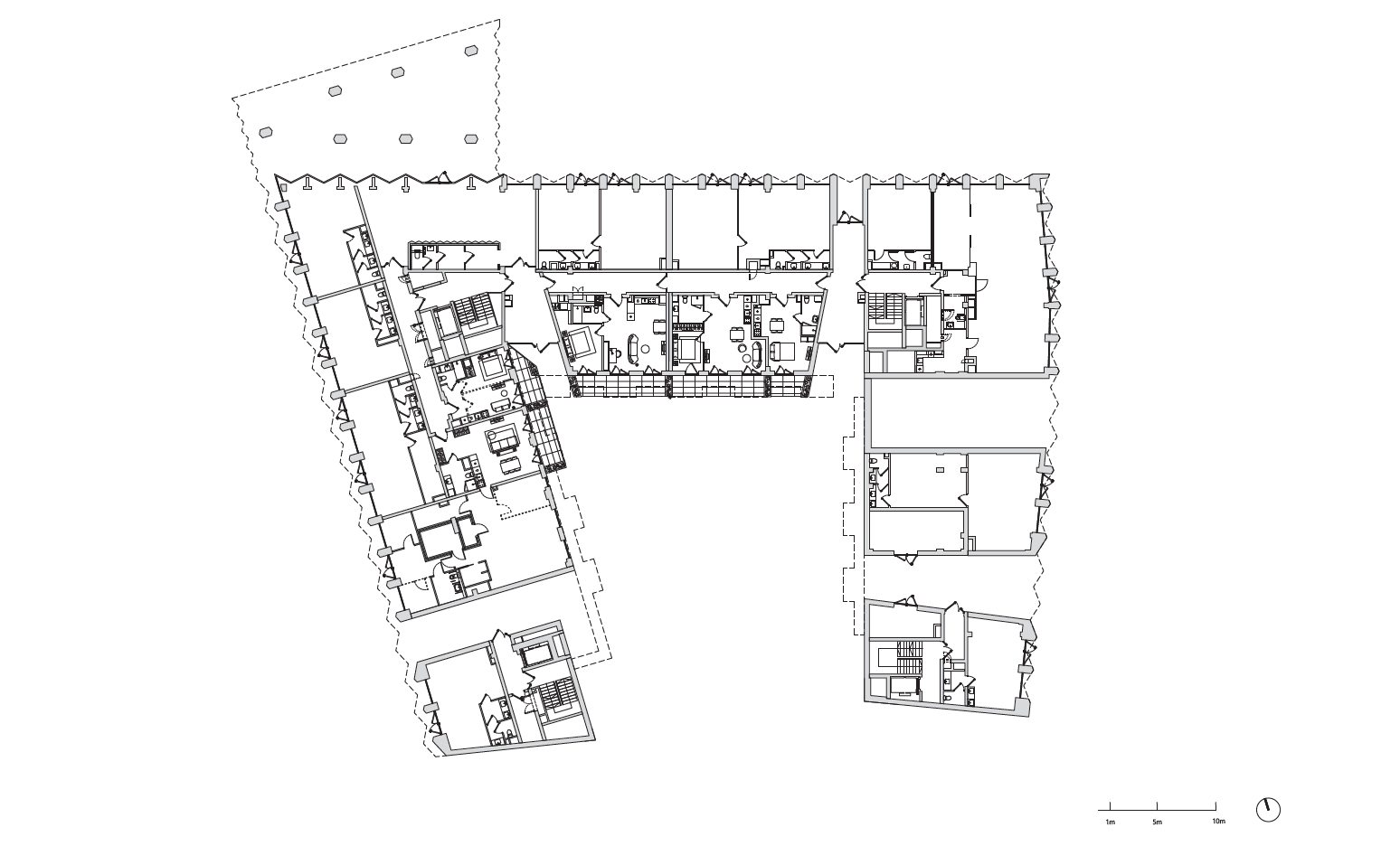Az épület minden oldalán fűrészfogas a homlokzati sík, de ez a cakkos alak visszaköszön utána a homlokzati burkolaton – a konkáv éleken is, itt ugyanis a téglaszeletek halszálka motívummal vannak felrakva. Ahogy az Aluprof versenyének keretében az ember bele tud merülni a homlokzati rendszerek világába, és megismer például olyan szakszavakat is, mint a „labirintusprofil”, úgy megérti azt is, hogy ez a fenti játék nem pusztán egyszerű esztétikai geg, ezek a ki- és bevágások a tervezők mellett kihívások elé állítják a kivitelezőket, gyártókat, a mérnöki, termodinamikai vagy vízelvezetési gondolatmeneteket. A Bernardynska 4 ezekkel együtt mutat mozgalmas látványt, a téglaszelet színe, porozitása pedig ismét – mint mindig – ráébreszt, milyen hatással van a tégla a kortárs formákra – miként képes megszerettetni bármilyen modern tömböt a történeti szövetekben is.