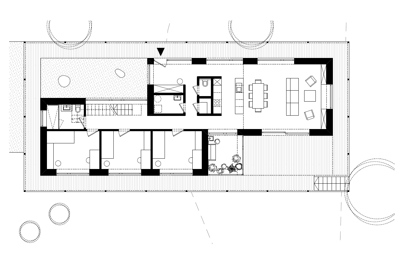 De hogy is van ez? A tulajdonosok számára a hosszanti telken létrejövő kert nagyon fontos volt, a szobákkal is minél közvetlenebb kapcsolatba akartak kerülni vele. A telek hátuljában növénytermesztésre is van mód, és a kezdeti vízió egy olyan megoldás volt valójában, mely a lejtős viszonyok miatt a kis gazdaság felé tud „repülni”. Ha hangsúlyos konzolszerkezet nem is jött létre, ettől függetlenül a látványos tornác kiváló pódium a „birodalom” belátására. A ház különlegessége, hogy ez a tornác amúgy a teljes házat körbeöleli, azaz a főhomlokzatnál és a két oldalsó homlokzatnál is folyosó vonul végig. Mindez a közelebbre eső szomszéd épület miatt akár az intimitást megbontó lépés is lehetett volna, azonban az egész tömeget megtolták a telek belseje felé, és így a kialakult köztes térrel és a tornácra nyíló nagy nyitásokkal csak előnyt nyertek a konyha és a nappali jó benapozása által.