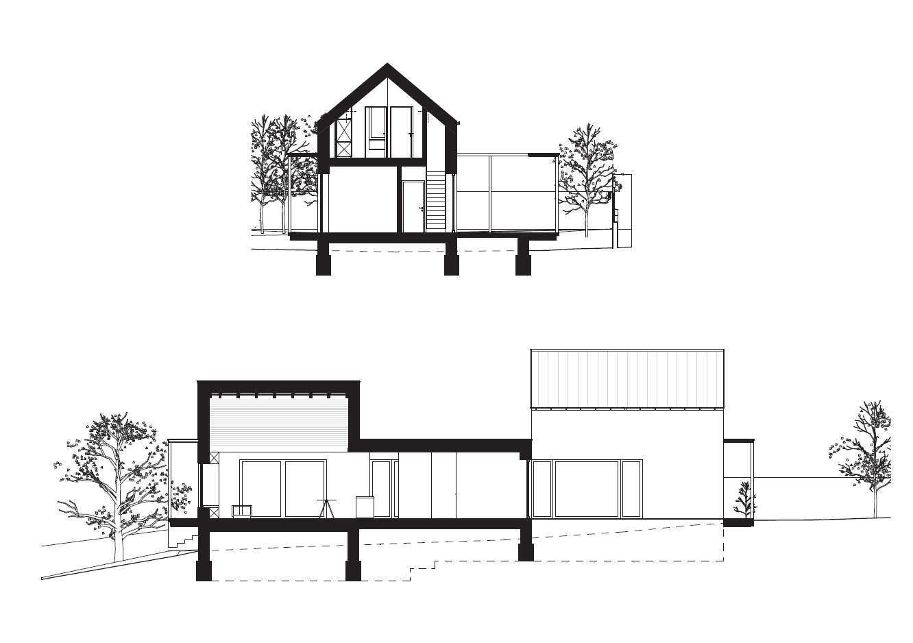 Kalandos, de éppen a fentiek miatt a ház építéstörténete egy féléves régészeti ásatással kellett kezdődjön, és elő is kerültek avar kori leletek a munkálatok alatt. A ház szó szerint a múltra építkezhet hát, amit azzal folytat, hogy nyeregtetős megoldása szintén tradícióból merít, és a környékbeli településképi arculat jellegzetes formáit absztrahálja. Ezt persze már hallottuk jó sokszor – a nyeregetetős archetípussal való játék elég bejáratott dolog, ennek ellenére meglepő, hogy még mindig van olyan útja-módja, amivel meglepnek az építészek, és nem jön ki könyökünkön ez a visszacsatolás.