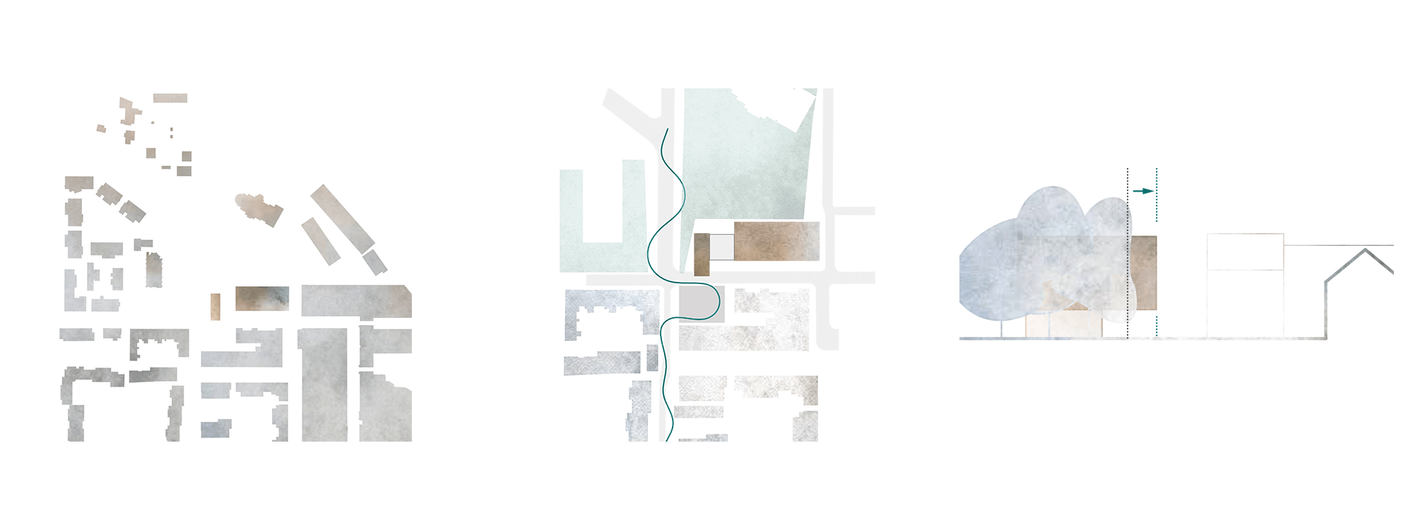 A Finlayson területe sűrűn beépített, az épületek az utcák mentén zárt térfalakat képeznek. Ez a tömörség észak–nyugat felé feloldódik, a parkban a palota és a templom szabadon álló kisebb méretű épületei pavilon szerűen helyezkednek el. E két eltérő karakter határán helyezkedik el a tervezési helyszín. Telepítésünk célja a Finlayson tömbjének lezárása és a parkos terület felé való felszakadozásának kialakítása.