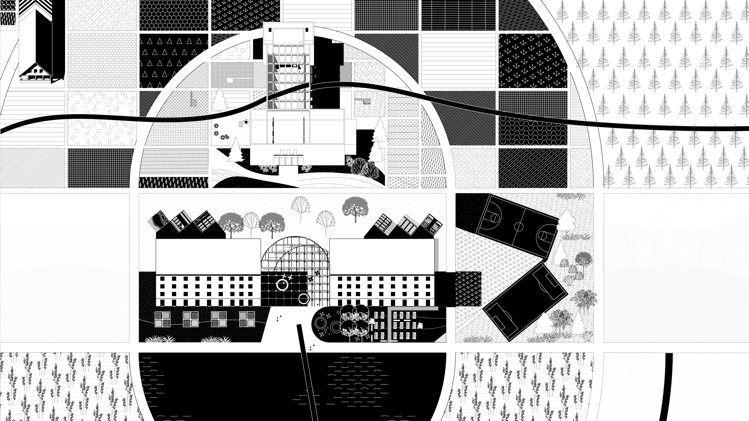 A meglévő területeket zöld mezőgazdasági területté és támogató épített környezetté alakítottam át, amely a mintatelep új, alternatív társadalmi életét aktivizálja. Az épülettömbök alatti térbeli állapotot a közösség és a termelés számára terveztem át, amely lehetővé teszi a gazdálkodást és a társadalmi tevékenységet. A szezonális tájkiegészítés finomsága a klasztereket jelentősebb szegmensekkel bővíti, és ezek átfedései megmutatják az új társulások és a programozatlan funkciók lehetőségeit. A táj és zöldterületek támogatói szerepének kihangsúlyozása adja a projekt bázisát.