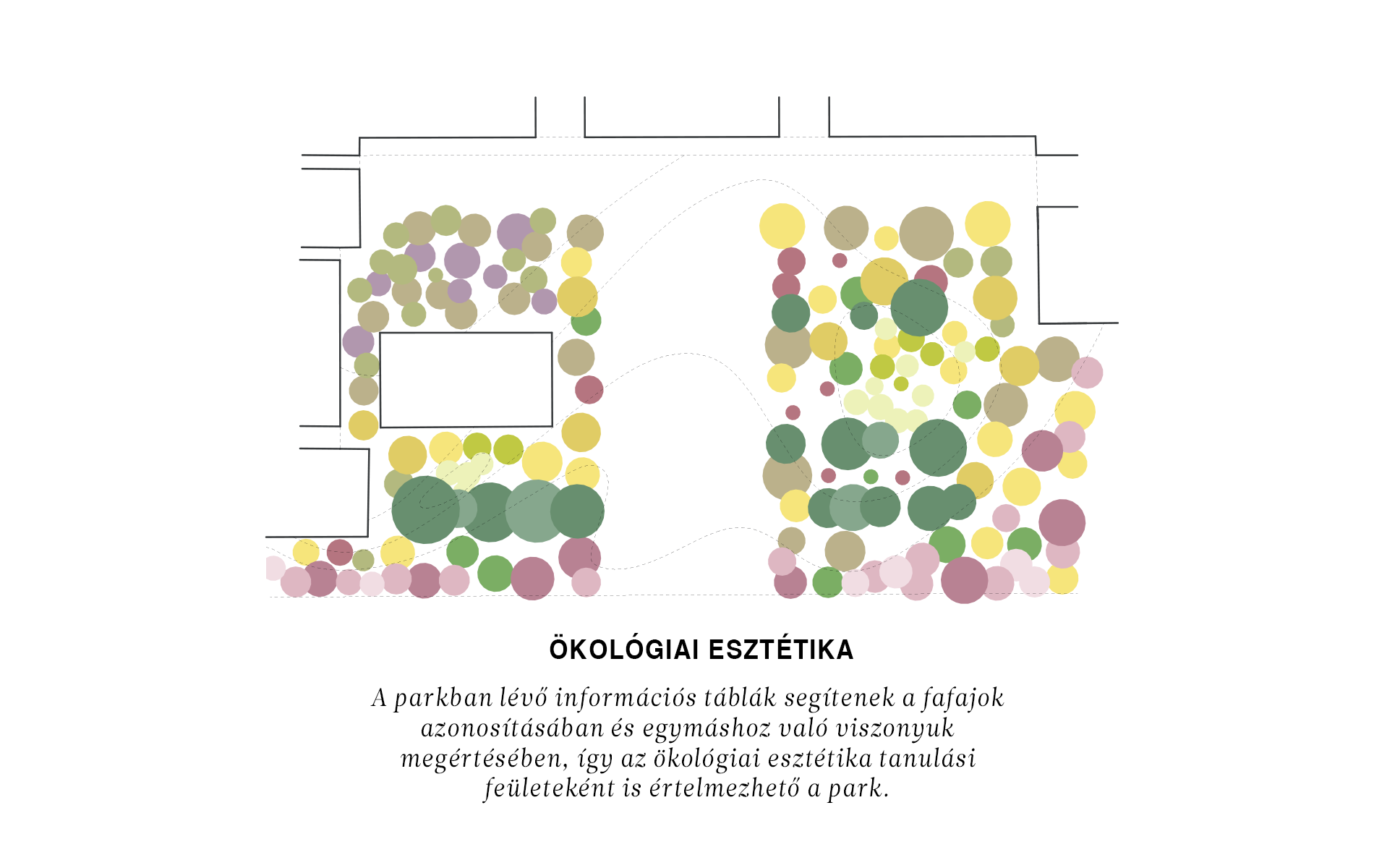 Az erdőben tisztások biztosítják a pihenőtereket, ahol a fák keretezik az eget és a parkbeli cselekményeket. A rendezvénytér és a megújuló homlokzat előtti tér nagyobb, míg az erdei pihenők és alkotóterek, valamint a rendezvényudvar kisebb tisztásokként jelennek meg. A tisztásokon a parkban mindenhol megtalálható mobil székek, a lépcsőzések és az erdei pihenő formációk biztosítják a pihenés egyéni és társas formáit.