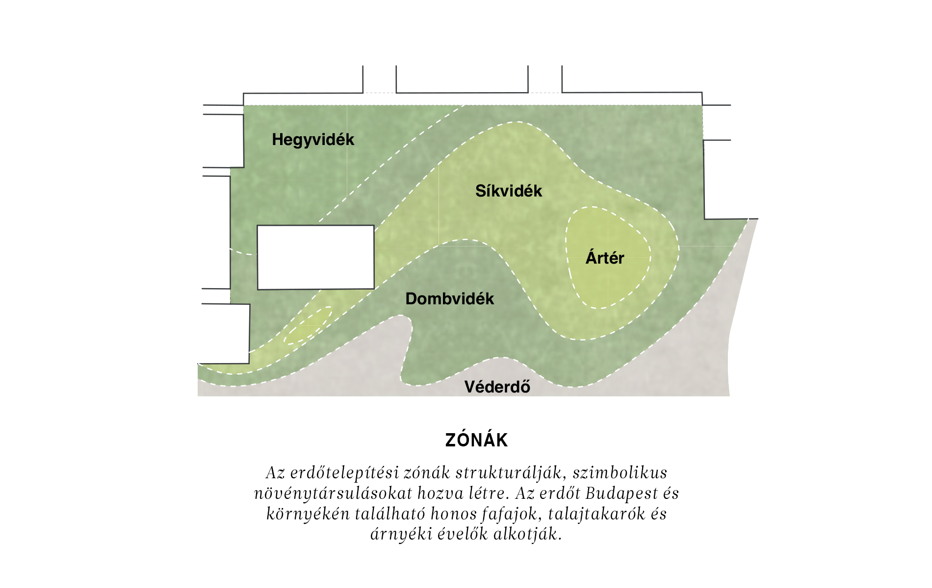 Az erdőtelepítést zónák strukturálják (véderdő – dombvidéki – síkvidéki – ártéri – hegyvidéki), minden részen sajátos növénytársulásokat hozva létre. Az erdőt Budapest és környékén található honos fafajok, talajtakarók, árnyéki évelők és alacsony cserjék alkotják. Az ilyen módon kialakított erdő a lehető legkevésbé fenntartásigényes zöldfelület.