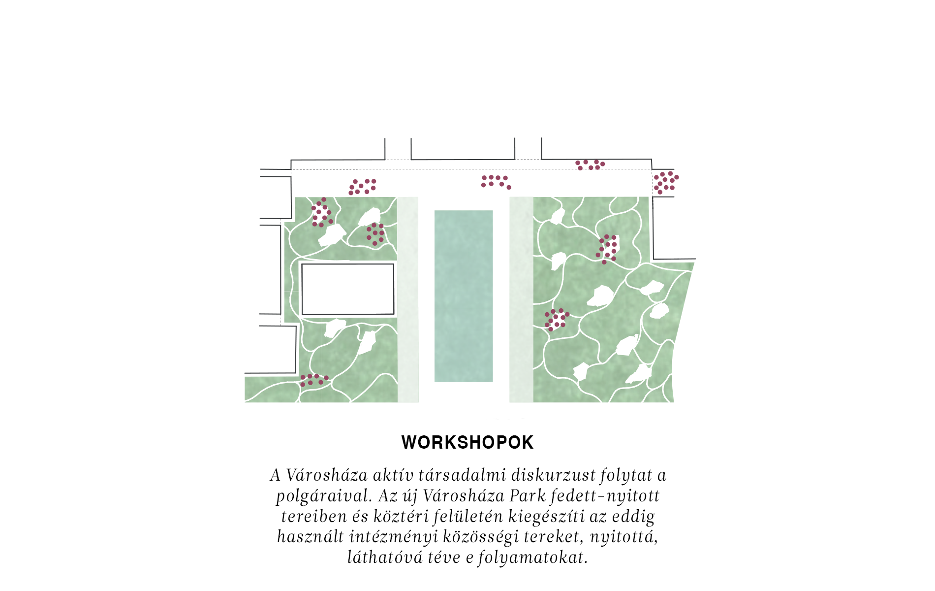 A kávézó és a Merlin épülete a kulturális tevékenységen túl a vendéglátást biztosítják, a parkhasználat kevésbé aktív időszakaiban is életet generálva. A Merlin épülete és a Budapest Infópónt (a főváros általános kommunikációs tere) közti területen jön létre a Budapest jövőjéről való gondolkodás tere: a workshop tér.