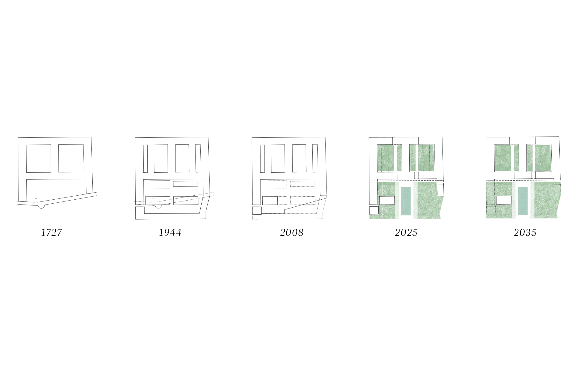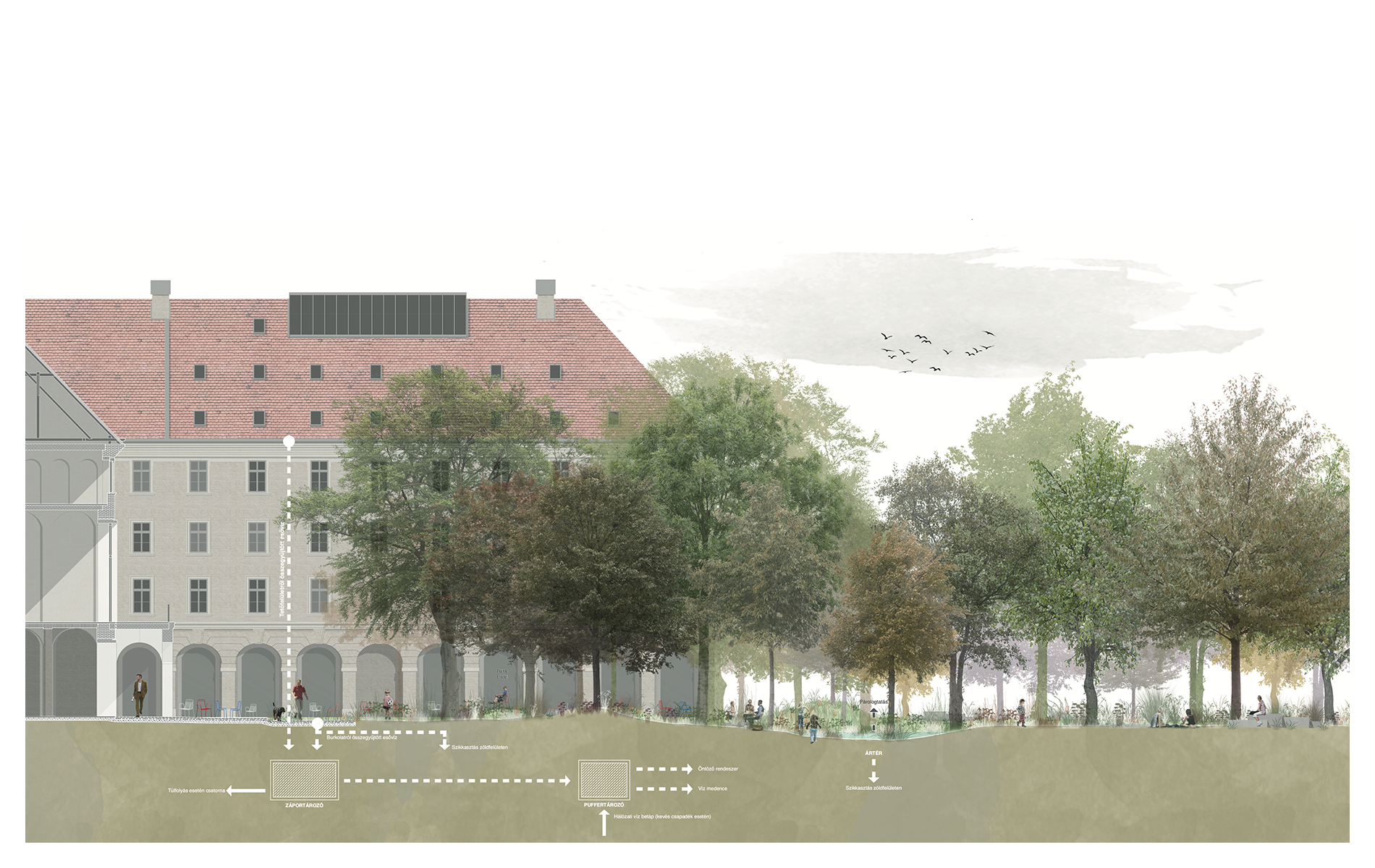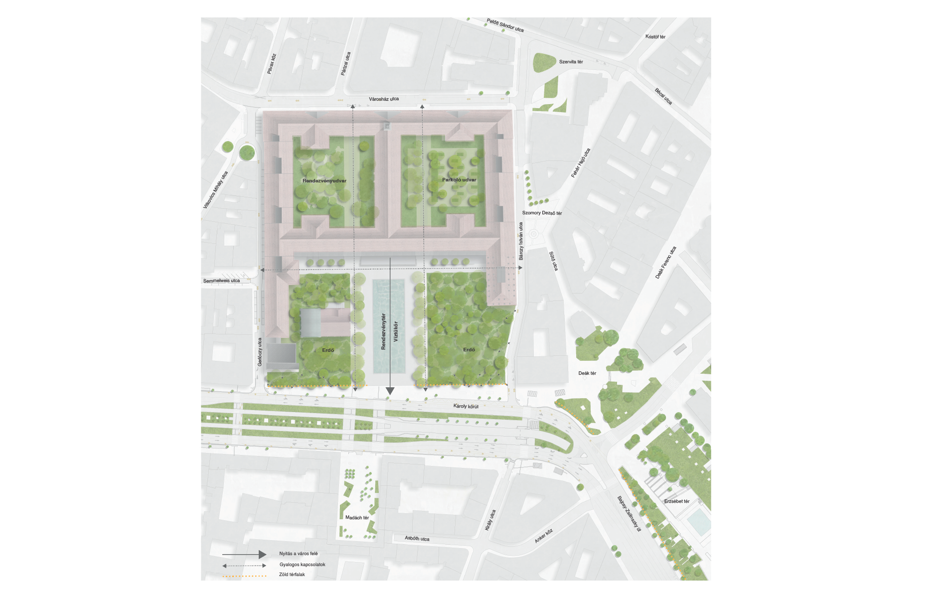 A bontás a távlati cél, a teret úgy tervezzük, hogy egyből megvalósulhasson, működhessen már addig is, amíg még az intézmény strukturális átalakítása, a kiköltözés évtizedei zajlanak. Ekkor kapcsolódik majd be igazán a város szövetébe, a Semmelweis utca és a Szomory Dezső tér felől is megnyílva.