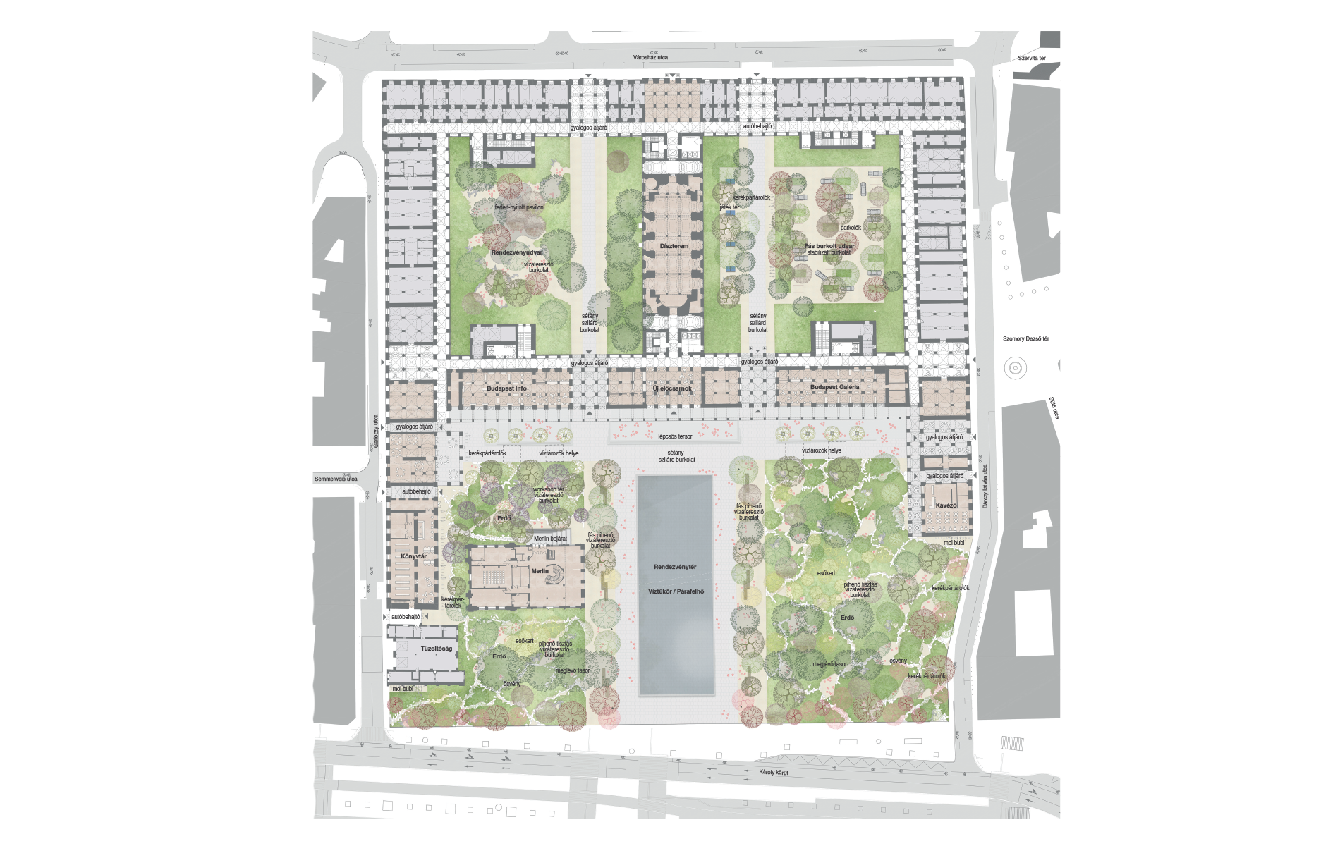 Az új bejárathoz vezető klasszikus városi tér következmény: a nagyléptékű rendezvényekhez szükséges lehető legkisebb burkolt felületen kapcsolja össze a Kiskörutat a városházával. Szélein a fasorok árnyékolnak, közepén a vízfelület párologtat és hűt.