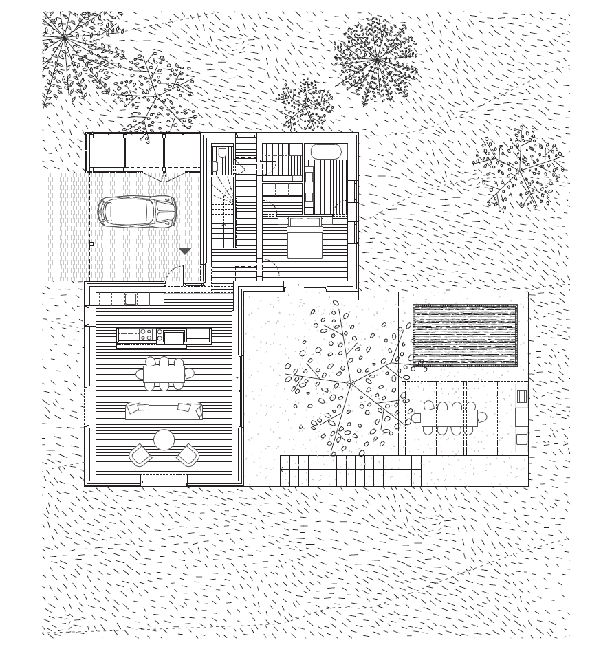 Többszöri nekifutás után sem állt azonban össze ez a program, amire válaszul a tervező a sarkuknál összekapcsolódó két négyzetes alaprajzú, magastetős tömeg kompozícióját dolgozta ki. Így az előrébb tolt, a szintvonalakra merőleges, nyitott födémű, nagy belső légterű nappali-étkező-konyha egységre merőlegesen érkezik be a földszinti szülői hálót, emeleti gyerekszobákat magába foglaló második tömeg, amelyek között a kapcsolatot a keskeny lépcsősor és a hálószoba-szárny fafödémszerkezetének kifutása teremti meg. Ez a sarkos kapcsolat ráadásul lehetőséget teremtett arra, hogy az épületkontúrba integrált, mégis nyitott kocsibeálló felé is kifusson a tetősík.