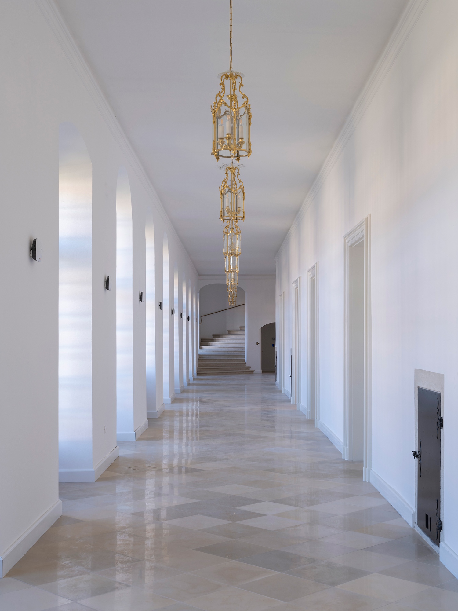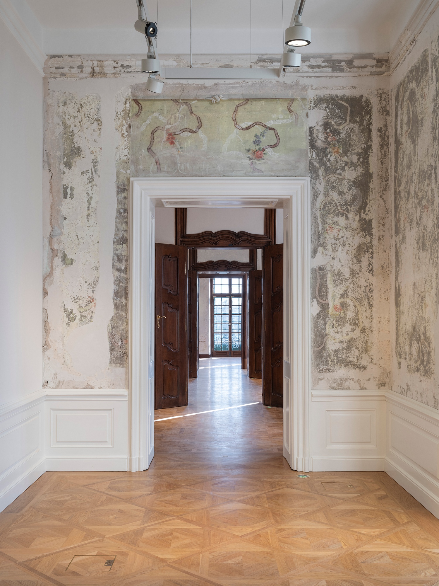 Nem a barokk tökéletes pompáját kívánták visszahozni, hanem a meglévő elemek hű használatával – például a megmaradt nyílászárók restaurálásával vagy korhű újragyártásával – egyfajta érzetet kelteni, jelzéseket elhelyezni. Hiszen sejthető, de konkrétan nem ismert, hogy mi és hol volt aranyozva, milyen volt az eredeti falfestés. Ehelyett most egységesen minden egy távolságtartóbb fehér színt kapott. Mindezt tovább erősíti a padlóburkolat és a lábazat tökéletessége és a falak tökéletlensége közötti kontraszt is.