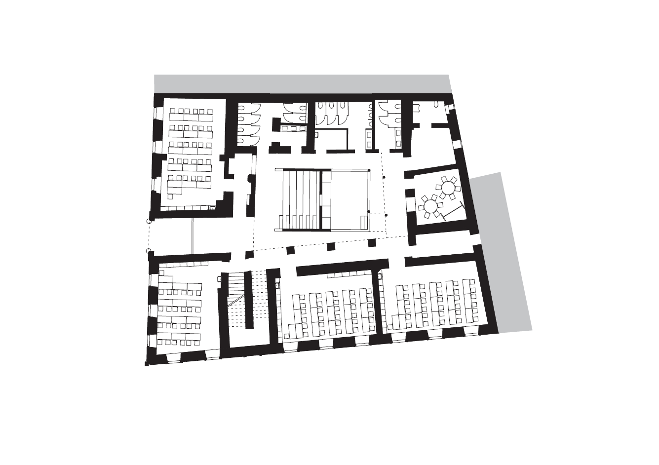 A lépcsős tanulási táj alsó része előadó-szerűen van kialakítva, efölött a köztes szinten a tér fókuszpontjaként ható kiscsoportos terasz található. Innen az emeletre lépcső és akár karzatként is használható híd vezet. E híd köti össze és biztosítja a körbejárhatóságot az emeleten: a két oldalon az eredeti folyosón, a szomszéddal határos traktusban a nyitott „tanuló tájon” keresztül, ami nagyméretű nyílásokon át kapcsolódik a fedett udvarhoz. Mindez átlátásokat, vizuális kapcsolatokat teremt a térrészek között, erősítve az összetartozás érzését is.