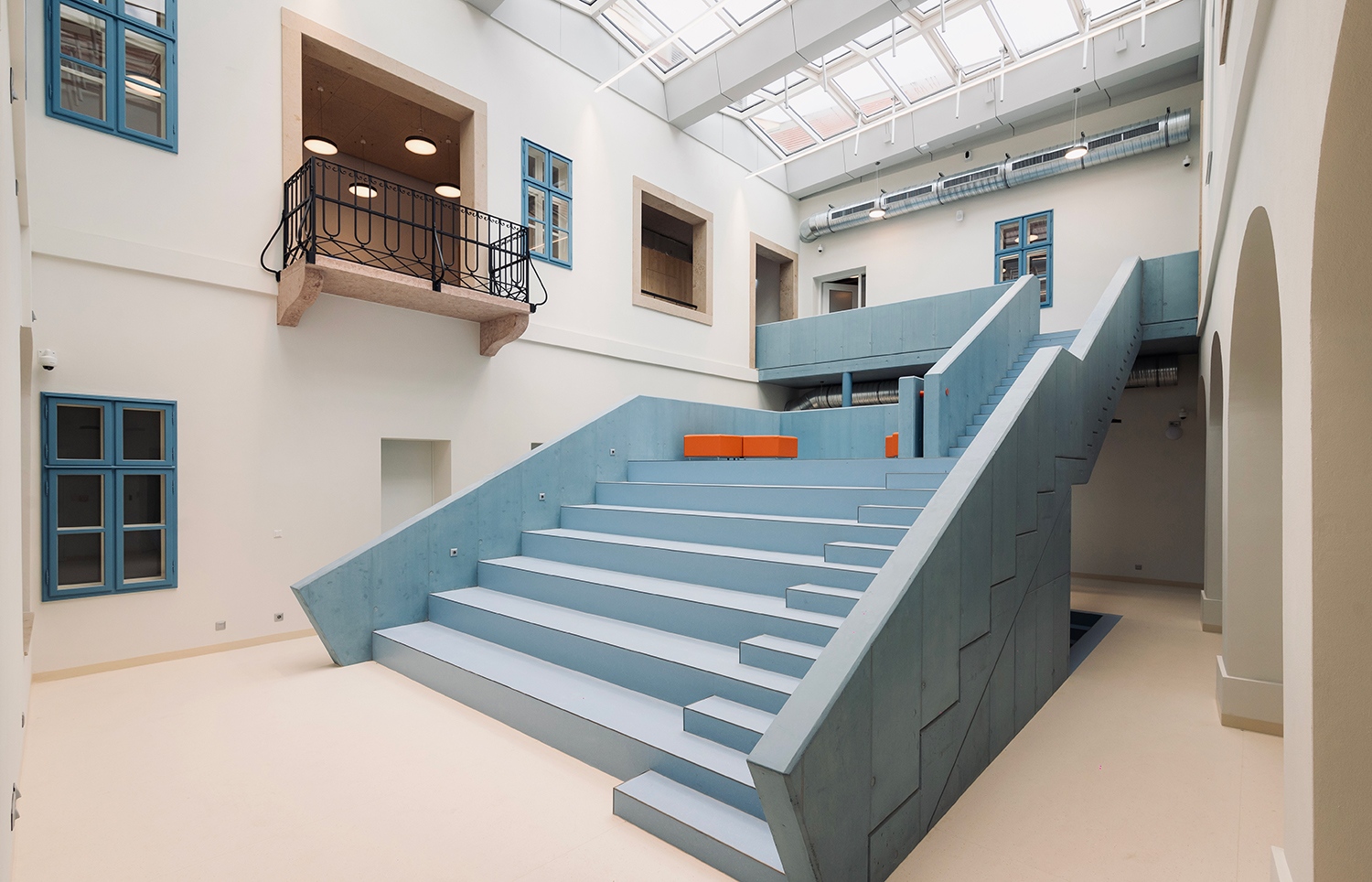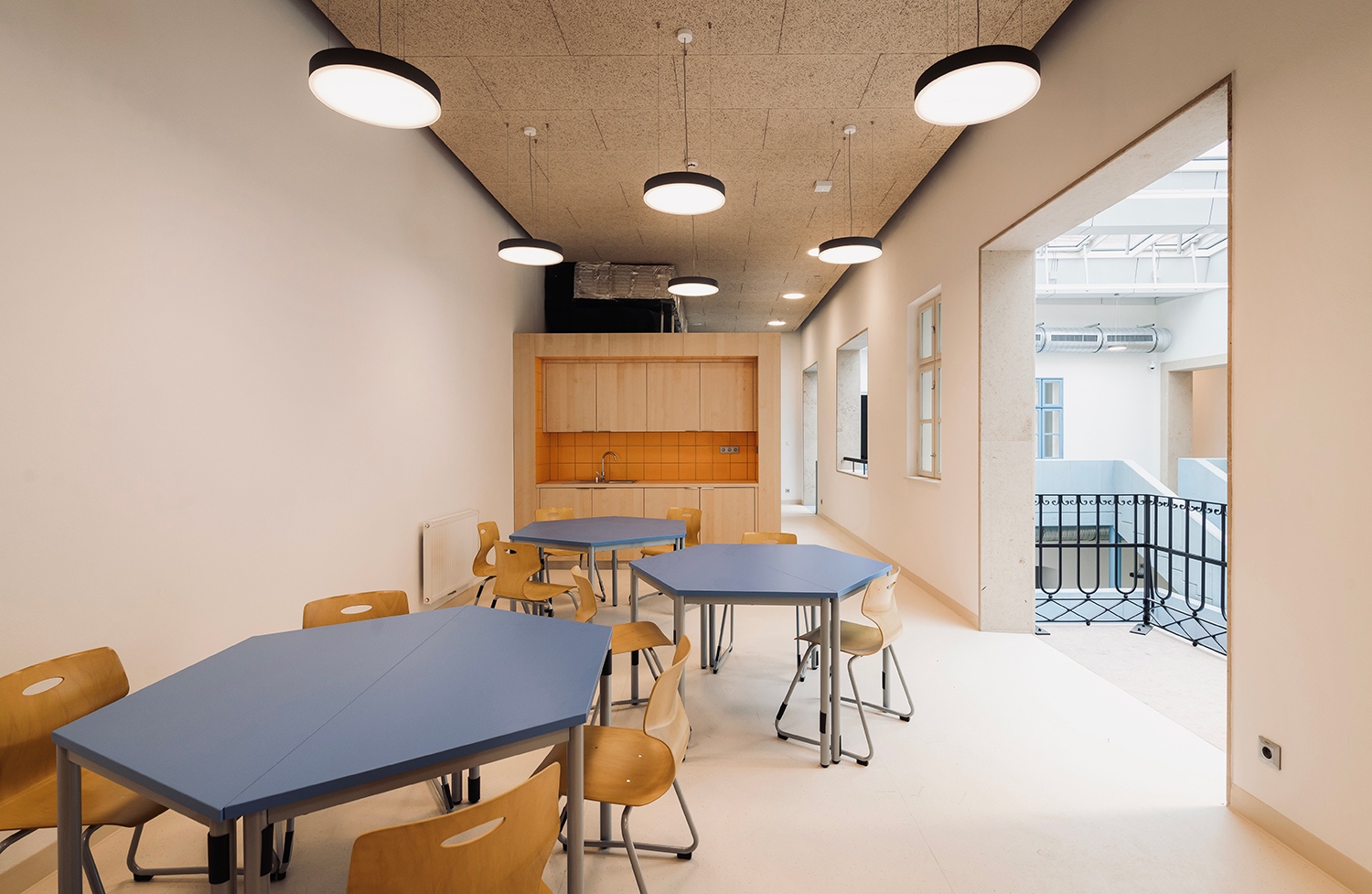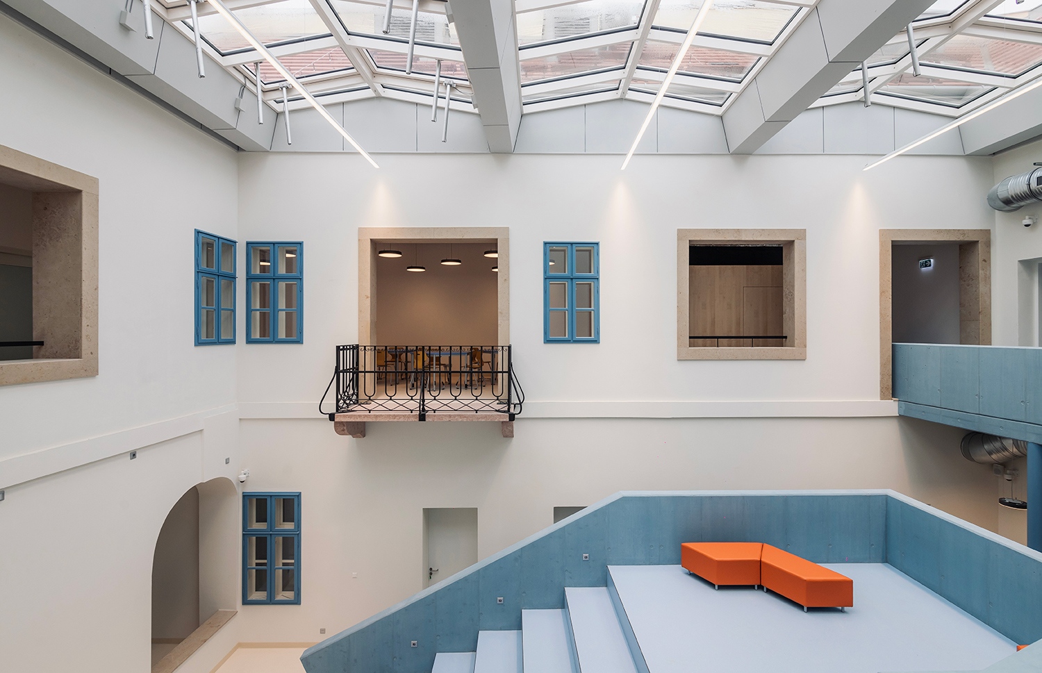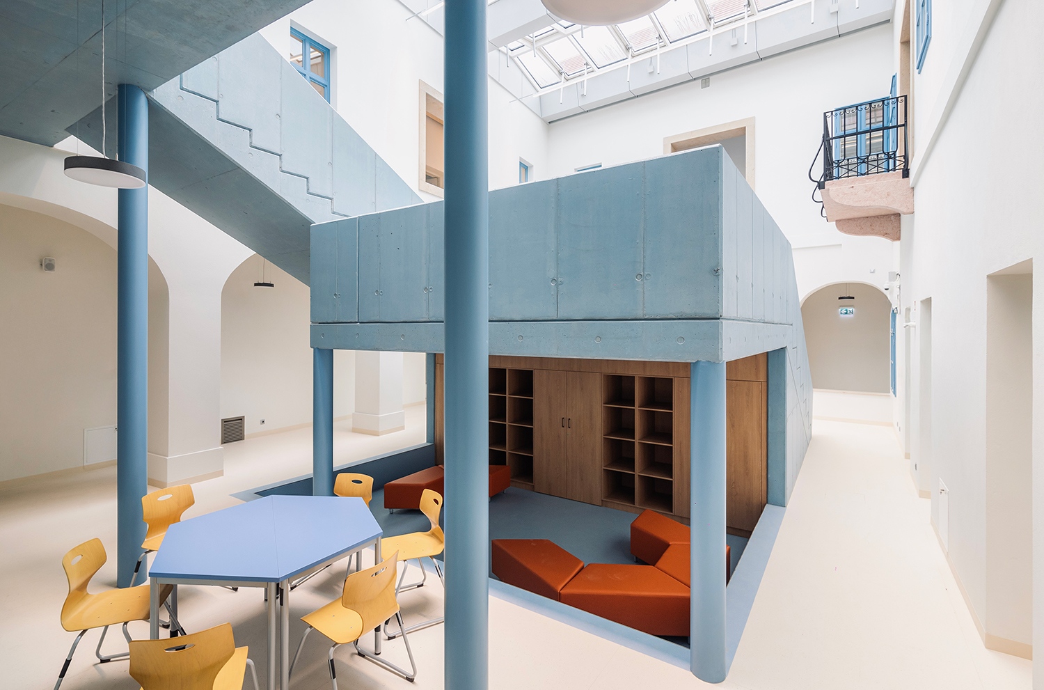 A gimnázium központi eleme az épületszárnyakkal közbezárt, üvegtetővel lefedett belső udvar, és ebben a teret szervező és figyelemfelkeltő, kékre festett lépcsős tanulási táj szoborszerű alakja. Az egykori kapualjon keresztül lépünk az udvarhoz, ahonnan mind a földszinti árkádsor, mind az emeleti áttöréseken keresztül érzékelhető a terek rendszere, és a lépcsős struktúra könnyen értelmezhető közlekedési útvonala átláthatóságot és ezzel együtt a biztonság és otthonosság érzetét is nyújtja.