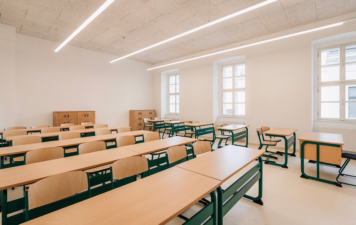 Szintenként négy-négy osztályterem található, mindegyike közvetlenül a központi térsorból nyílik, az udvar köré szervezetten. A termek az épület szerkezeti rendszeréből, a kötöttségekből adódóan téglány alaprajzúak, és hagyományos tantermi arányokat követnek. A meglévőségek miatt a tantermeknél sajnos nem valósulhatott meg az innovatív pedagógiai elvekkel konform alaprajzi, pl. a „forgó tanteremi” elrendezés, de ezt ellensúlyozandó a tantermekben megfelelő infrastruktúra előkészítésével lehetőség van az átrendezésére.
