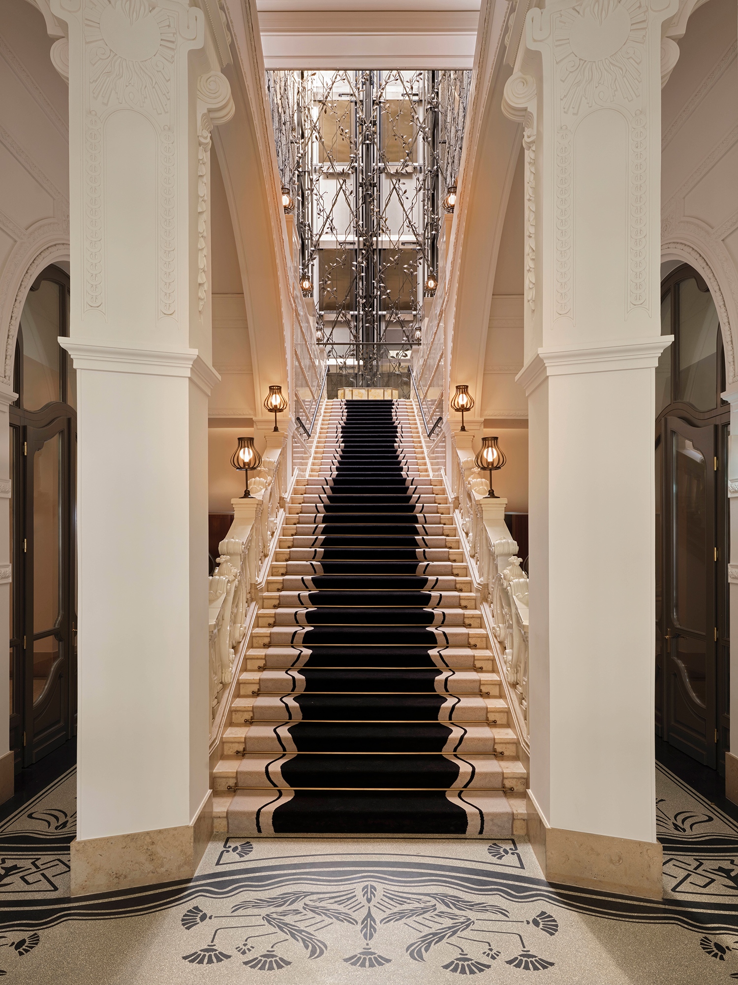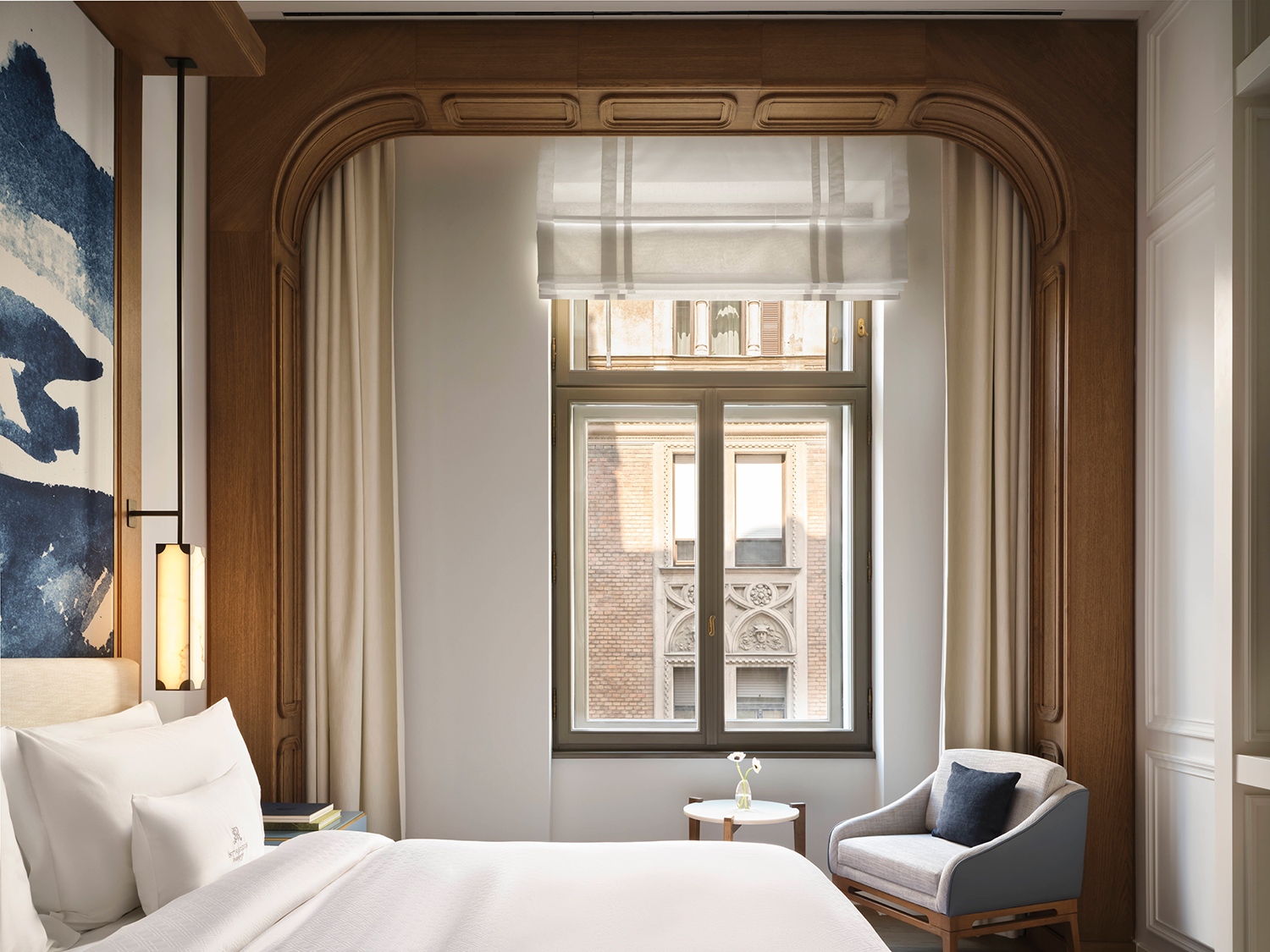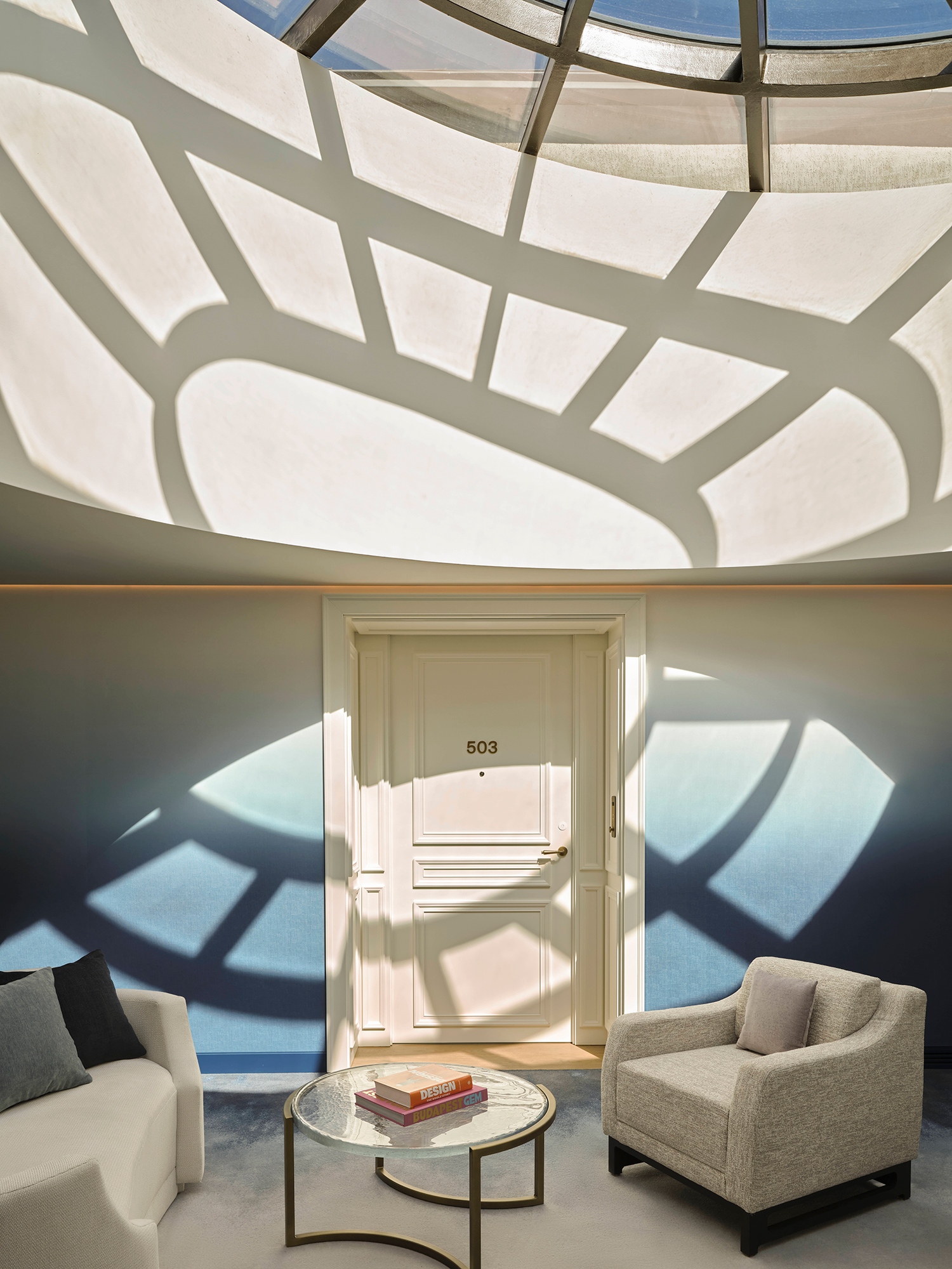 A szálloda belső terei a Duna hullámzását és fényjátékait idézik. Ez a vizuális narratíva végigvonul az egész épületen a lágy kék tónusok, a hullámzó minták és a csillogó felületek révén. Mindezt a magyar fürdőkultúra ihlette részletek – kerámiák, dekoratív csempék és gőzszerű textúrák – egészítik ki. A belsőépítészetben megjelennek a szecesszió jegyei, a bronz részletek és az íves formák, hangsúlyozva Budapest művészeti örökségét. A bejáratnál egy grandiózus lépcsőház fogadja az érkezőket, amelyet egyfajta „függőleges fényfolyóként” álmodtak meg; a látványt szoborszerű kerámiák, tükröződő felületek és egy üvegfödém teszi teljessé, amelyet bronz virágminták és a Szász-Coburg-Gotha-korona ihlette csillárok díszítenek.