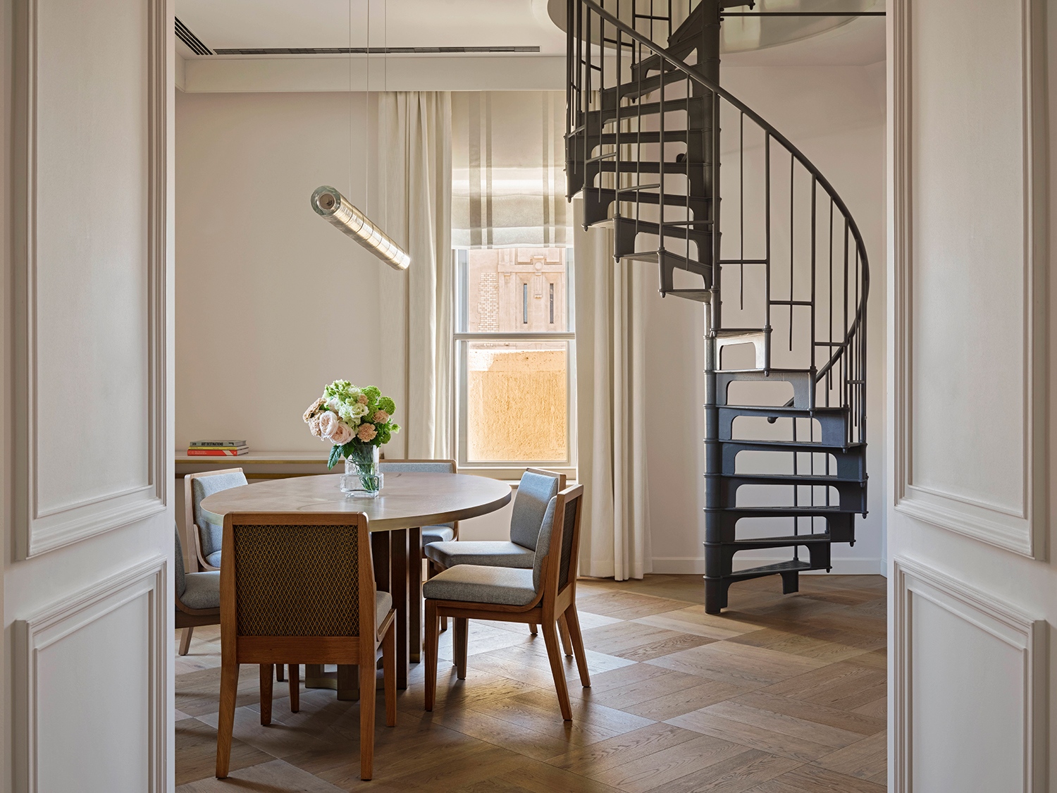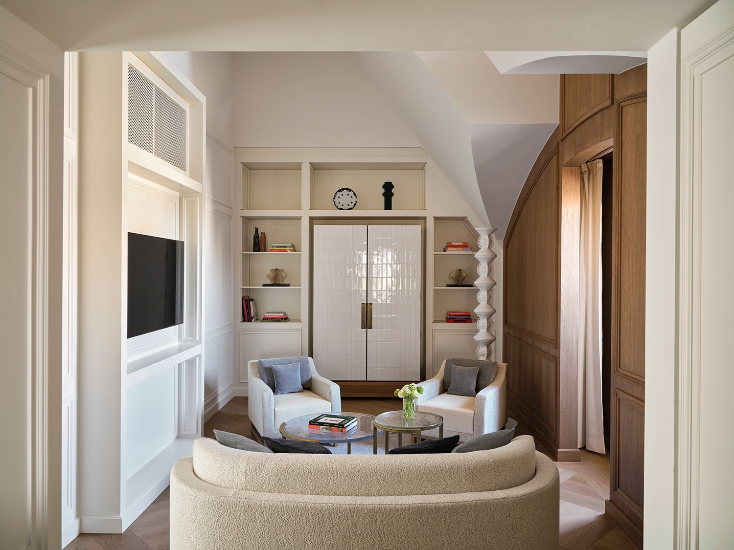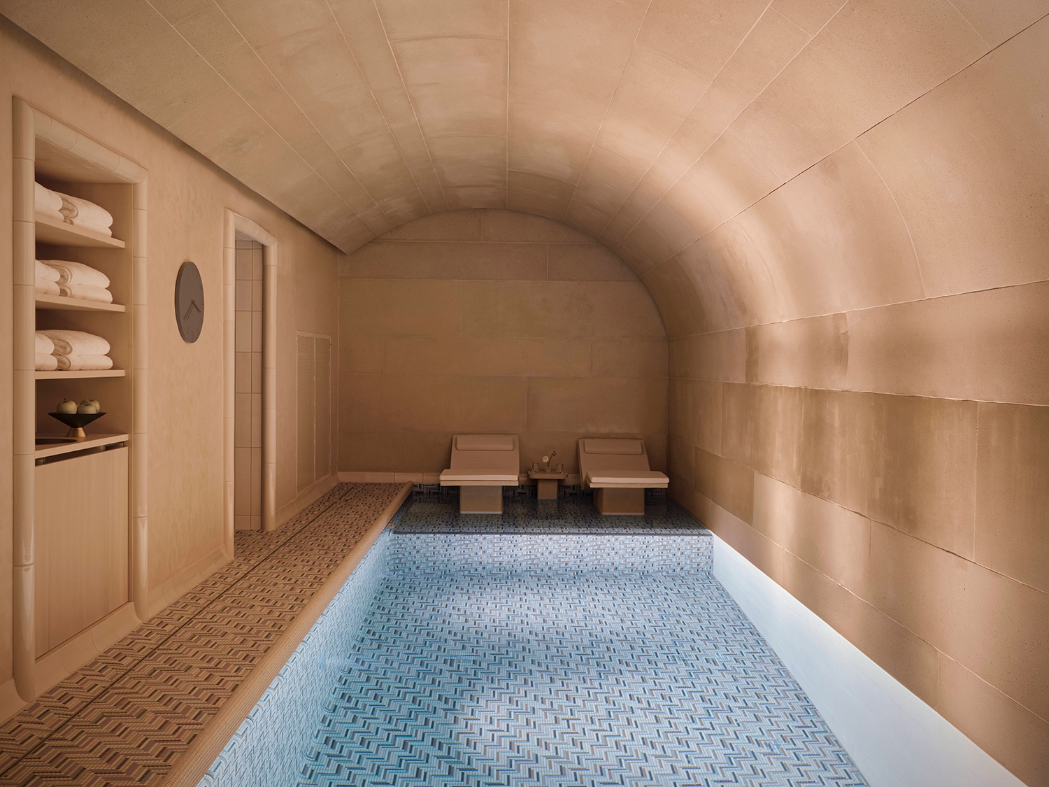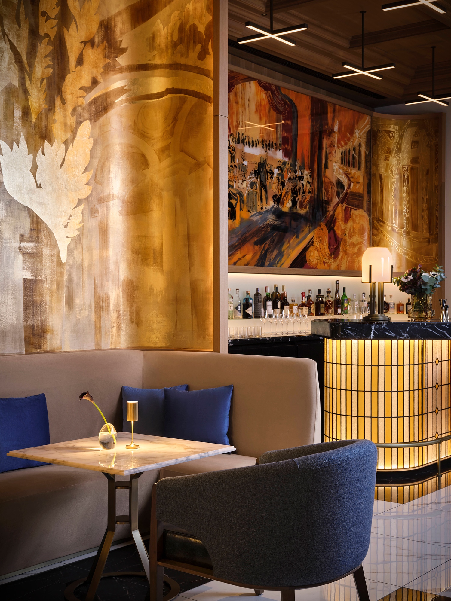 A szálloda belső terei a Duna hullámzását és fényjátékait idézik. Ez a vizuális narratíva végigvonul az egész épületen a lágy kék tónusok, a hullámzó minták és a csillogó felületek révén. Mindezt a magyar fürdőkultúra ihlette részletek – kerámiák, dekoratív csempék és gőzszerű textúrák – egészítik ki. A belsőépítészetben megjelennek a szecesszió jegyei, a bronz részletek és az íves formák, hangsúlyozva Budapest művészeti örökségét. A bejáratnál egy grandiózus lépcsőház fogadja az érkezőket, amelyet egyfajta „függőleges fényfolyóként” álmodtak meg; a látványt szoborszerű kerámiák, tükröződő felületek és egy üvegfödém teszi teljessé, amelyet bronz virágminták és a Szász-Coburg-Gotha-korona ihlette csillárok díszítenek.