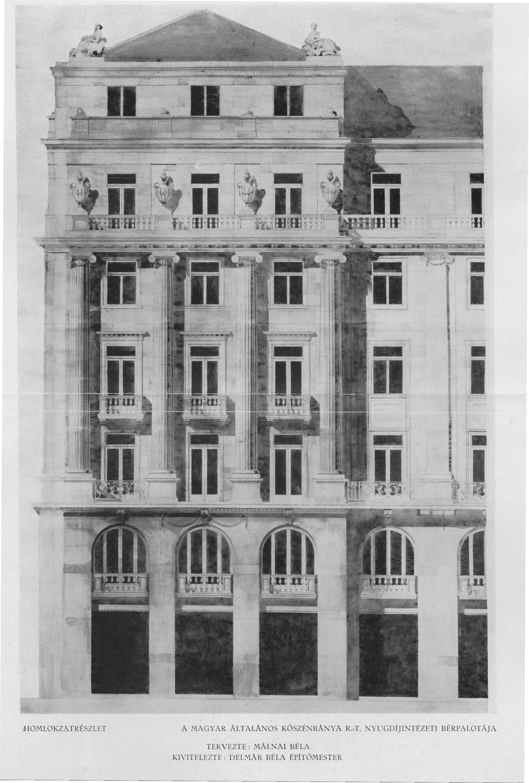 Zárt pályázaton jutott a megbízáshoz, a kiemelt helyszín, és a munka jellege miatt nem kapott szabad kezet a homlokzatok tervezésében. Wälder Gyula, a historizáló korszak kiemelt építésze felügyelte a munkát és írta elő a homlokzat karakterét. Málnai kezét az arányok, a ritmus, a szobordíszítések elhelyezése, illetve a belső terek kialakítása dicséri. A házra jellemző minőségi iparosmunka nagyvonalú belső terekbe került – eddigre már jelentős díszlettervezői tapasztalat állt Málnai háta mögött. Ebbe az épületbe tervezte később egyetlen art deco ízű munkáját, az Elysée Kávéház modern, áramvonalas belső terét, melyről a friss törekvések iránt elkötelezett Tér és Forma elismerő cikket közölt. A Kossuth tér körút felőli sarkára tervezett nívós bérpalotáról számos lapban jelent meg méltatás. E munka révén Málnai visszakerült a vérkeringésbe, a villák mellett ismét tervezett bérházakat, melyek homlokzatain és részleteiben a MÁK palota eleganciája annak pátosza nélkül köszön vissza.