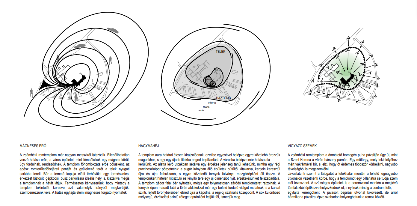 A hatás egyfajta elemi mágneses forgató nyomaték, amely a nyugati főhomlokzat felé terel. Fogadó terünket, a látogatói fogadó épületet ennek a hatásnak a figyelembevételével helyeztük el. A tér a Corvin János utca - Öregtemplom utca felőli, és így a városból gyalogosan érkezők számára is egyértelmű kiindulási pont. A területre belépve a látogatót a telekhatár mentén vezetjük körbe úgy, hogy a templomot egy pillanatra se tudja szem elől téveszteni. A program számára szükséges épületek szintén e peremvonal mentén, a meglévő támfalakból építkezve helyezkednek el, s nyílnak fel egyfajta kerengőként a centrum felé.