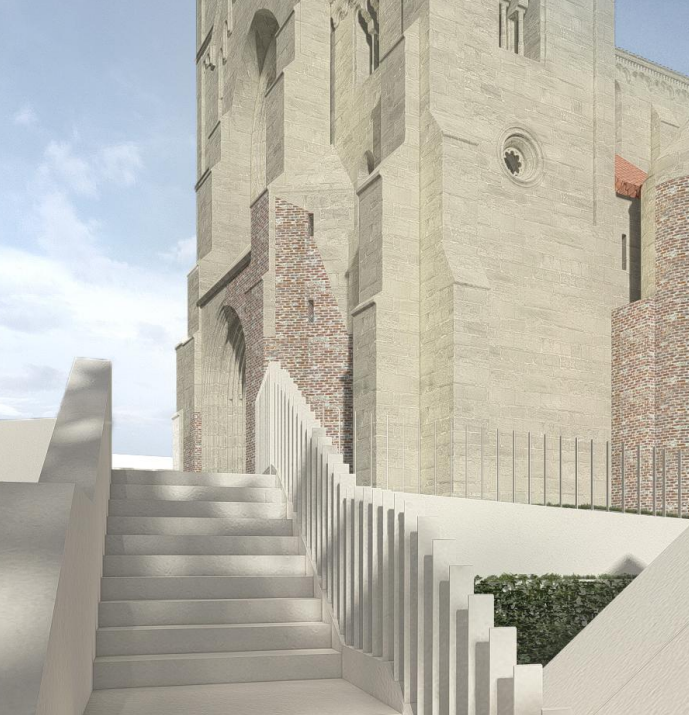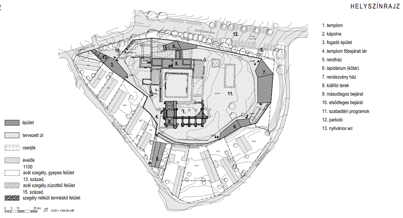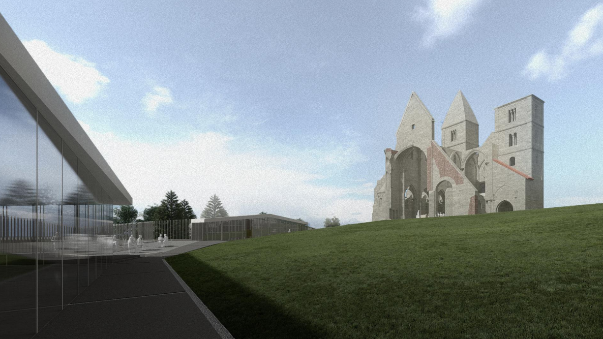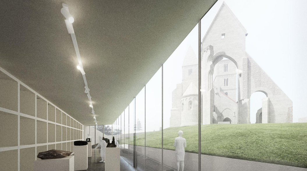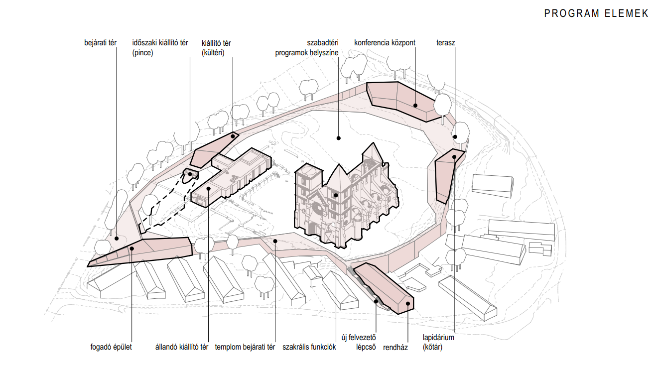 Kiállító terek: A Kőtár új helyre kerül, támfalépületként létesülhet. Hátsó határoló fala mentén flexibilis állványon a lehetőség szerint legnagyobb kapcsolódó szerkezetekben összeállított leletanyagot helyezzük el, a tér középső részén a kiemelt leletanyag látható. A tér üvegfala a templomra nyílik, az üveg felületen megjelenítve lennének a leletanyag elhelyezkedésének eredeti pozíciói.