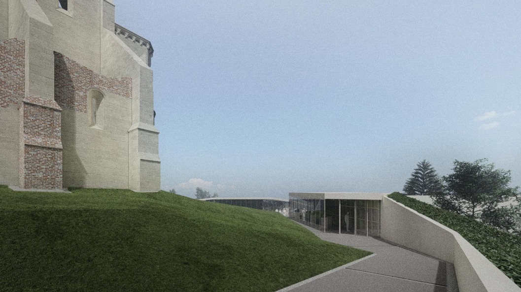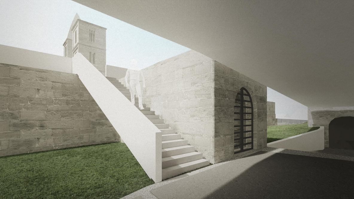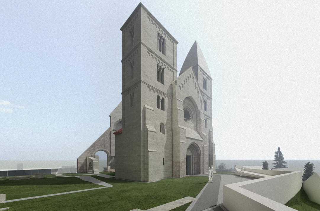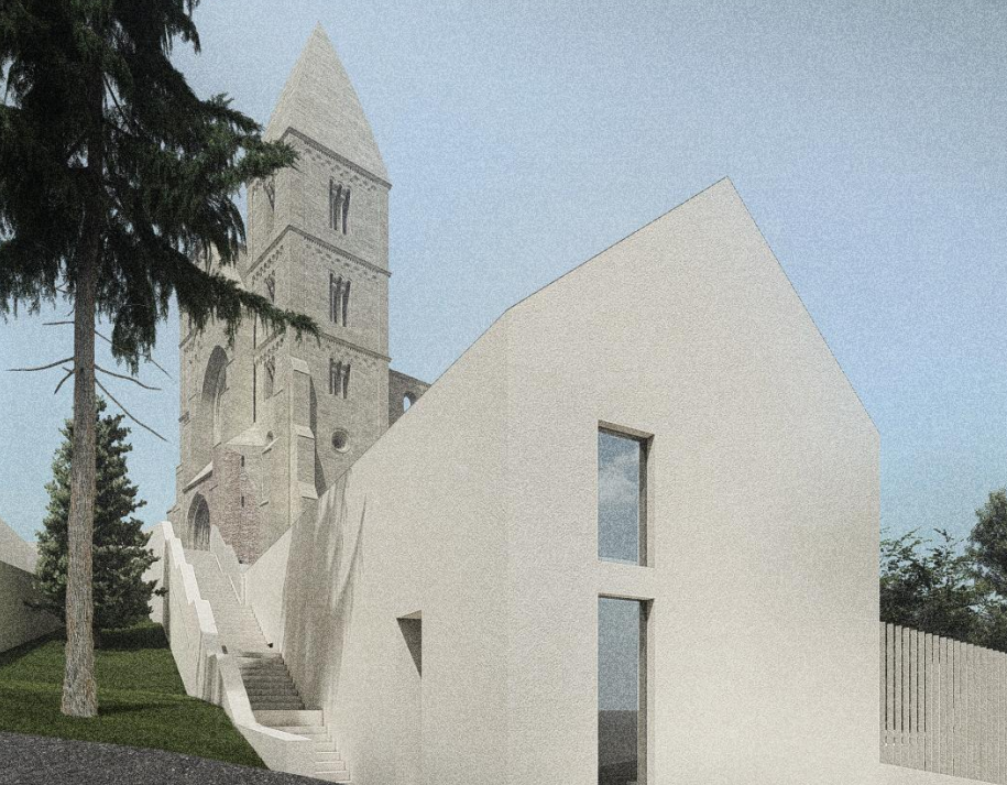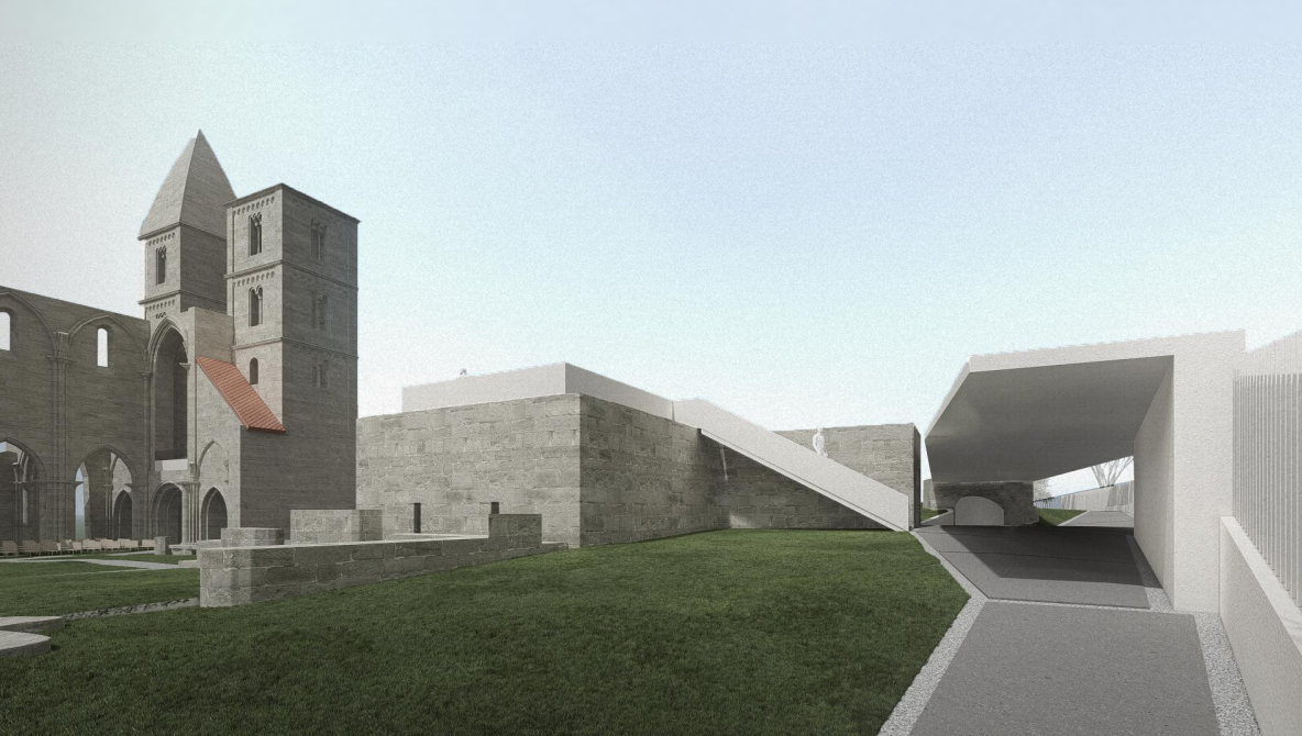 Kiállító terek: A Kőtár új helyre kerül, támfalépületként létesülhet. Hátsó határoló fala mentén flexibilis állványon a lehetőség szerint legnagyobb kapcsolódó szerkezetekben összeállított leletanyagot helyezzük el, a tér középső részén a kiemelt leletanyag látható. A tér üvegfala a templomra nyílik, az üveg felületen megjelenítve lennének a leletanyag elhelyezkedésének eredeti pozíciói.