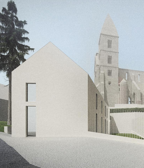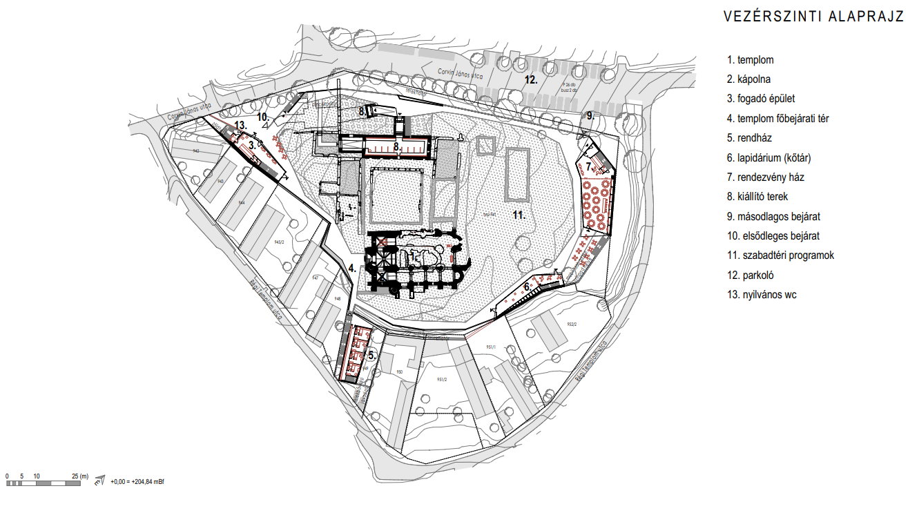 Rendház: A rendházat a Régi templom utca csatlakozó telkén helyezzük el, így legközelebb a templomhoz, de a látogatói útvonaltól nem érintve, az épület tömegét az Régi templom utca egységes utcaképébe illesztve. A rendház mellett elhelyezett külső lépcső lehetőséget teremt a szerzetesek számára a templom tereinek közvetlen megközelítésére, napi használatára és ezen 3 ingyenes, alternatív útvonal használat lehetővé tételére a hívek számára is. A rendház telkét a szomszédos telek benyúló nyugati részével javasoljuk megnövelni, így a rendház zárt kertje megnövelten kialakítható.