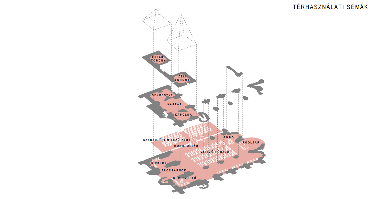 A főhajóban is megjelennek a szakrális funkciók. Az itt folyó, 100-200 fő részvételével tartott események várhatóan kivételes, egyedi alkalmak számára fog szolgálni, elsősorban kedvező időjárási viszonyok közt. Ezt a célt a főoltár menzájának eredeti helyén történő visszaállítása szolgálhatja, amely formájában visszafogottan, a tömboltároknak megfelelően egy egyszerű kőtömbből állna. Ennek liturgikus használatát a szabadon álló oltároknak megfelelően egy alkalmi hordozható oltár, mint kiegészítő elem tenné lehetővé.