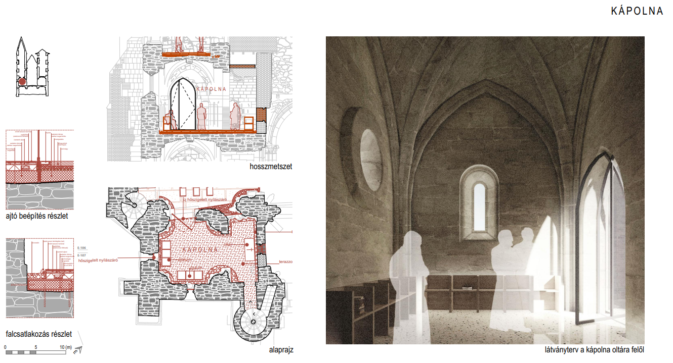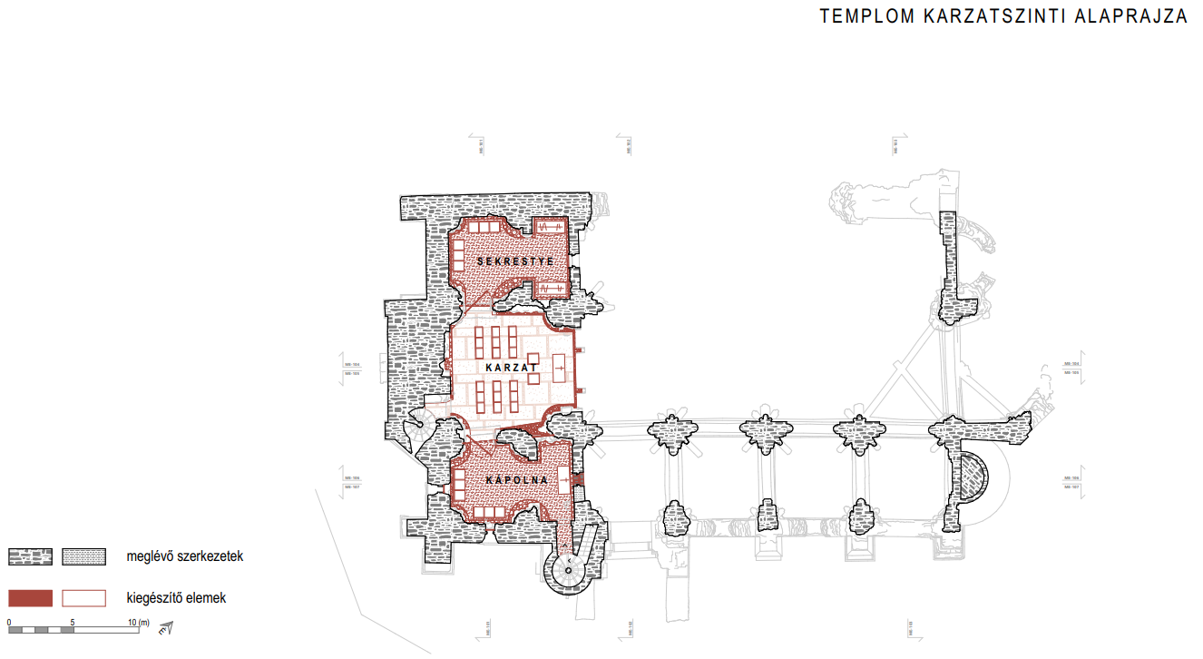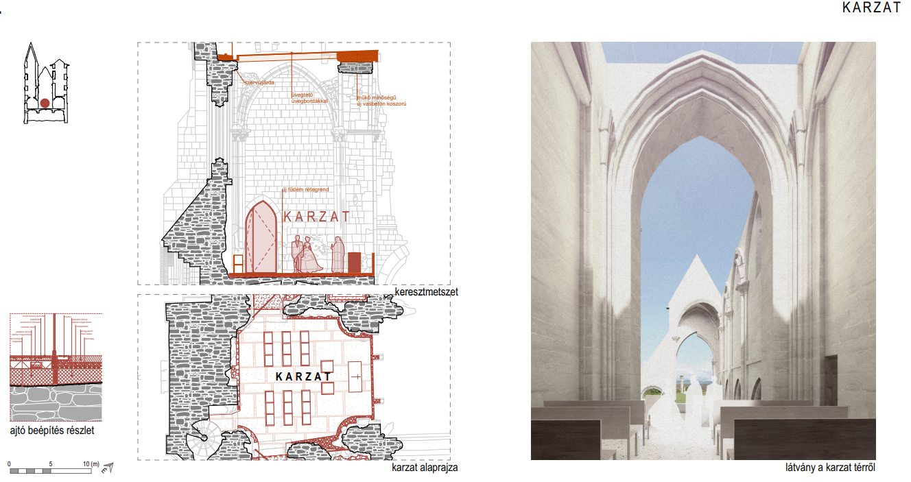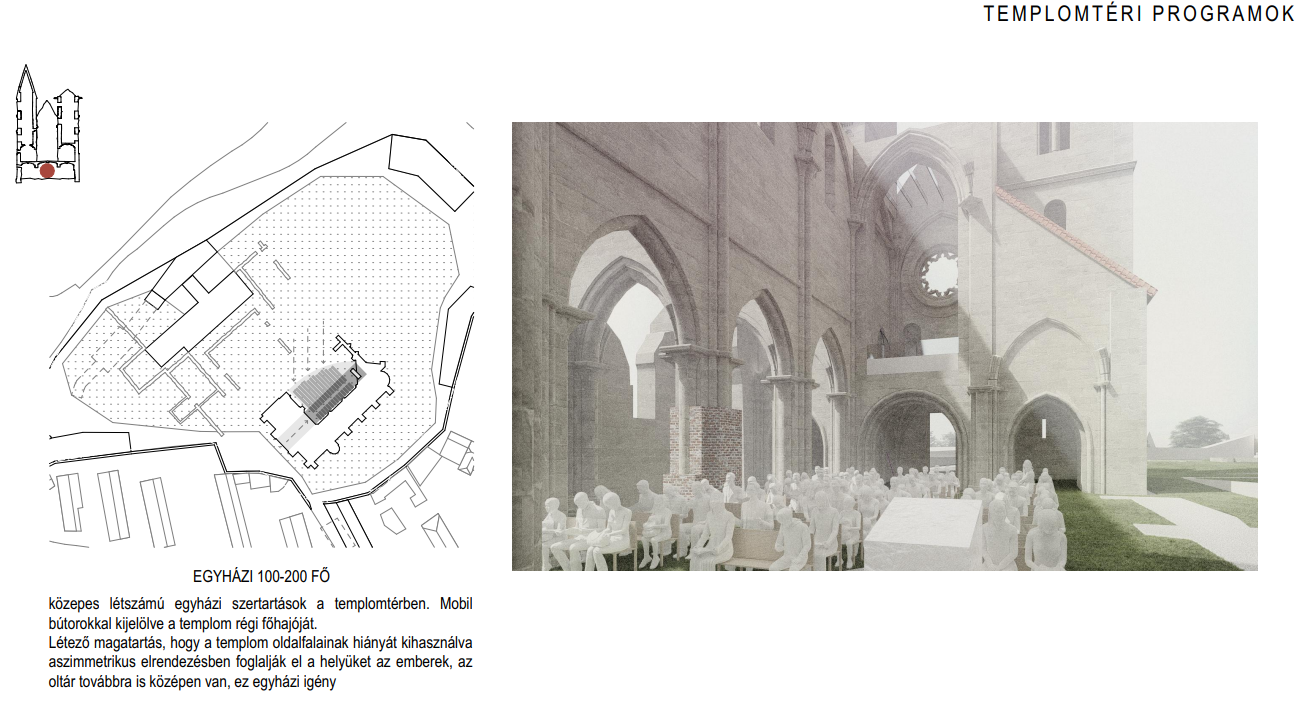 A templom szakrális és látogatói terei: A karzatról nyíló, de saját külső megközelítéssel is rendelkező térben, a déli torony alatt kápolnát alakítunk ki. A falak mentén ülőpadok, stallumok, a fal előtt oltár szolgálja az itt folyó zsolozsma vagy szentmise igényeit, a várhatóan korlátozott számú résztvevőinek elhelyezését, esetleg az elcsöndesülésre, meditációra mutatkozó igény kielégítését. Az oltárban középkori szokás szerint az oltárfelszerelés is elhelyezhető. Ez a tér tehát a templomrom zárható, fűthető, folyamatosan használható, szakrális csomópontja lehetne. A templom másik újonnan használatba vehető, felfedezhető, szakrális és világi, turisztikai eseményekre is alkalmas különleges tere a karzat. Üvegtetővel lefedve, a főhajó felé mellvéddel ellátva védett, fedett, a főhajó látványát e szintről megmutató, rendkívüli hatású tér.