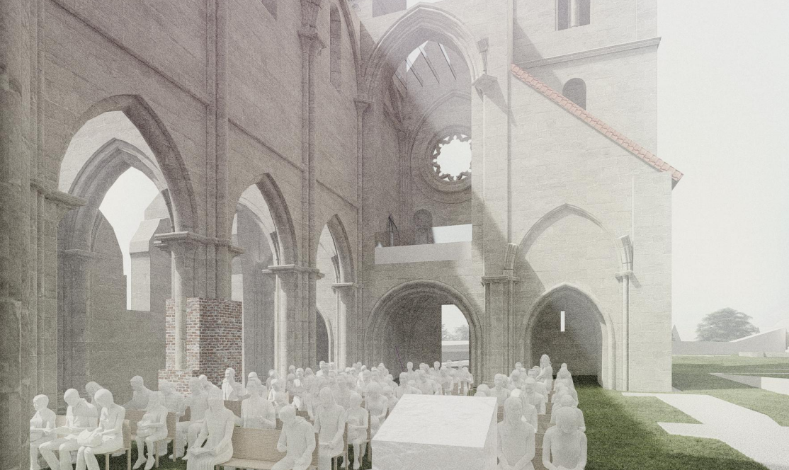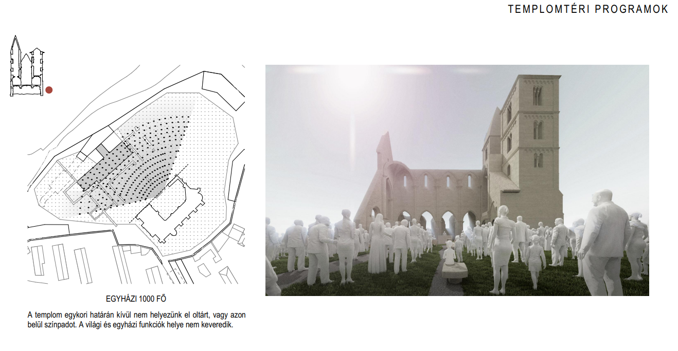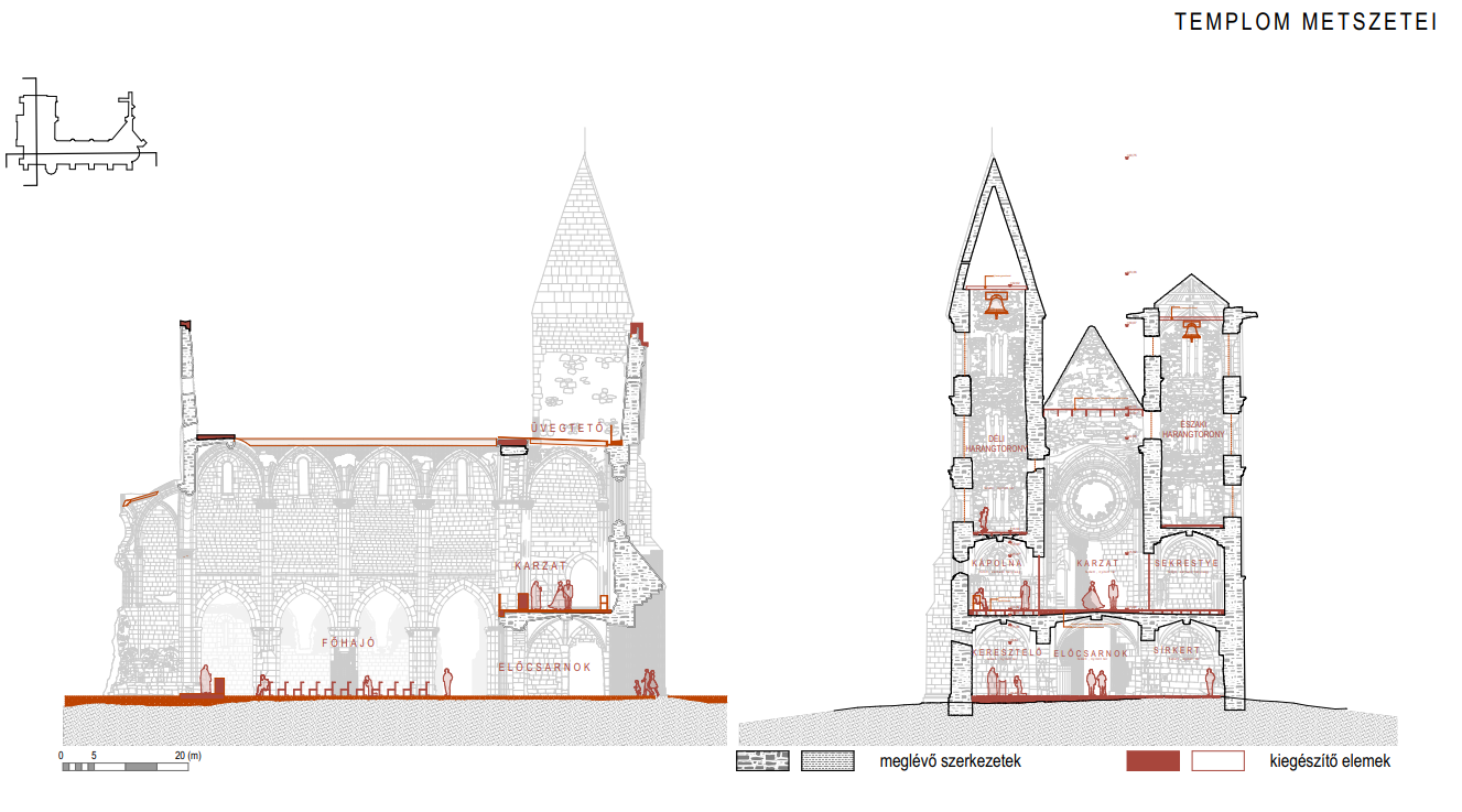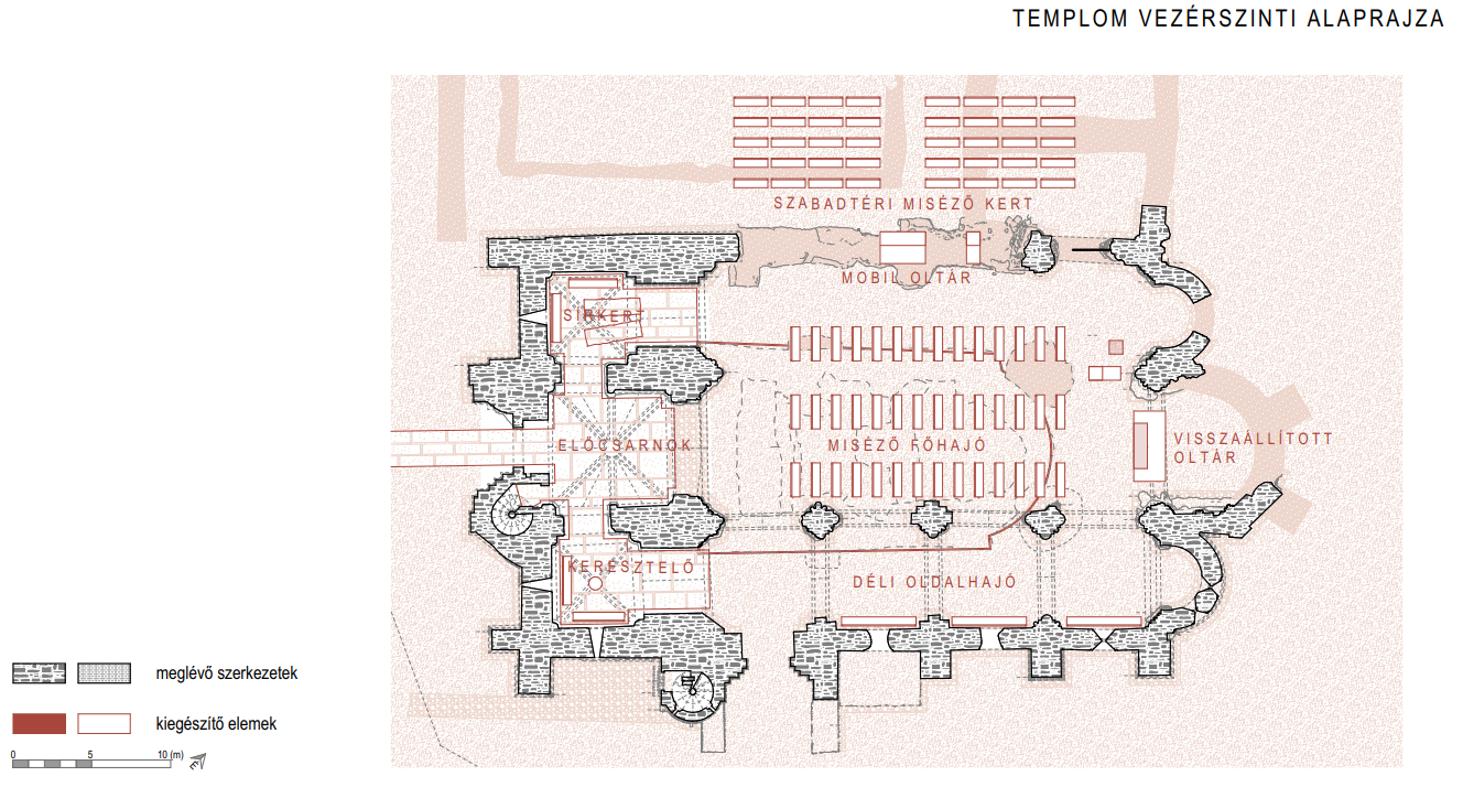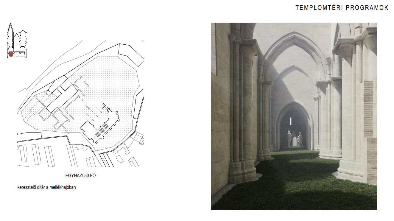 A templom szakrális és látogatói terei: A karzatról nyíló, de saját külső megközelítéssel is rendelkező térben, a déli torony alatt kápolnát alakítunk ki. A falak mentén ülőpadok, stallumok, a fal előtt oltár szolgálja az itt folyó zsolozsma vagy szentmise igényeit, a várhatóan korlátozott számú résztvevőinek elhelyezését, esetleg az elcsöndesülésre, meditációra mutatkozó igény kielégítését. Az oltárban középkori szokás szerint az oltárfelszerelés is elhelyezhető. Ez a tér tehát a templomrom zárható, fűthető, folyamatosan használható, szakrális csomópontja lehetne. A templom másik újonnan használatba vehető, felfedezhető, szakrális és világi, turisztikai eseményekre is alkalmas különleges tere a karzat. Üvegtetővel lefedve, a főhajó felé mellvéddel ellátva védett, fedett, a főhajó látványát e szintről megmutató, rendkívüli hatású tér.