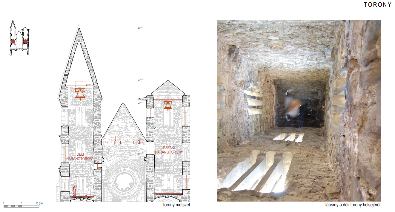 A tornyok közül a déli torony a csigalépcső felújításával a látogatók számára megközelíthetővé, különleges térélménnyé válhat. A tornyokban harangok elhelyezése is lehetséges, azok üzemeltetéséhez szolgáló hágcsórendszer a déli toronyból indulhat és a karzat feletti üvegtető párkánya felett az északi toronyban is beépíthető. A templom déli tornya alatti földszinti térben keresztelő medencét helyezünk el. A toronyaljból különleges látvány nyílik a déli mellékhajóra, megfelelő hátteret adva az itt folyó szertartásnak.