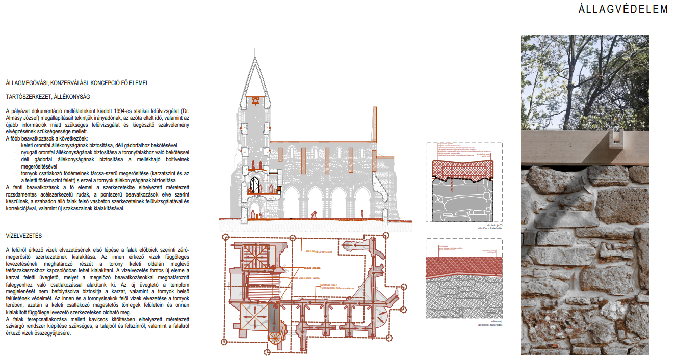 A pályázat során az 1994-es statikai felülvizsgálat (Dr. Almásy József) megállapításait tekintjük irányadónak. A kívánt beavatkozások fő elemei a szerkezetekbe elhelyezett, méretezett rozsdamentes acélszerkezetű rudak, melyek a pontszerű beavatkozások elve szerint készülnek, a szabadon álló falak felső vasbeton szerkezeteinek felülvizsgálatával és korrekciójával, valamint új szakaszainak kialakításával.