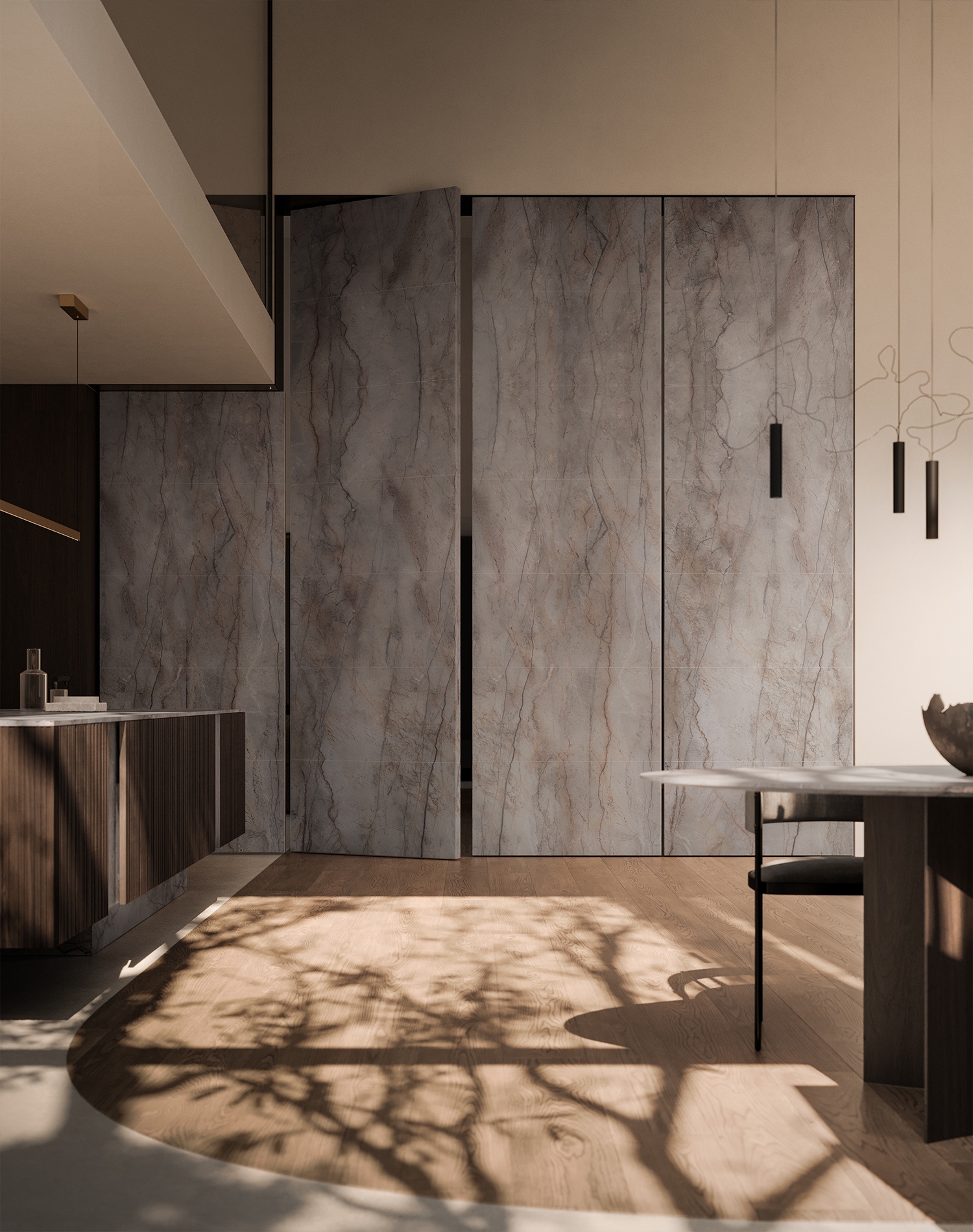 A meleg, csokoládé árnyalatú Moka diófa finom textúrája és a karakteres Silver Roots márvány látványos erezete tökéletes harmóniában olvad össze. A márvány mintázata az ősi fák gyökérzetére emlékeztet, erőteljes kontrasztot alkotva a természetes fa tónusaival – mintha a természet egy darabját emelnénk be az otthon szívébe.