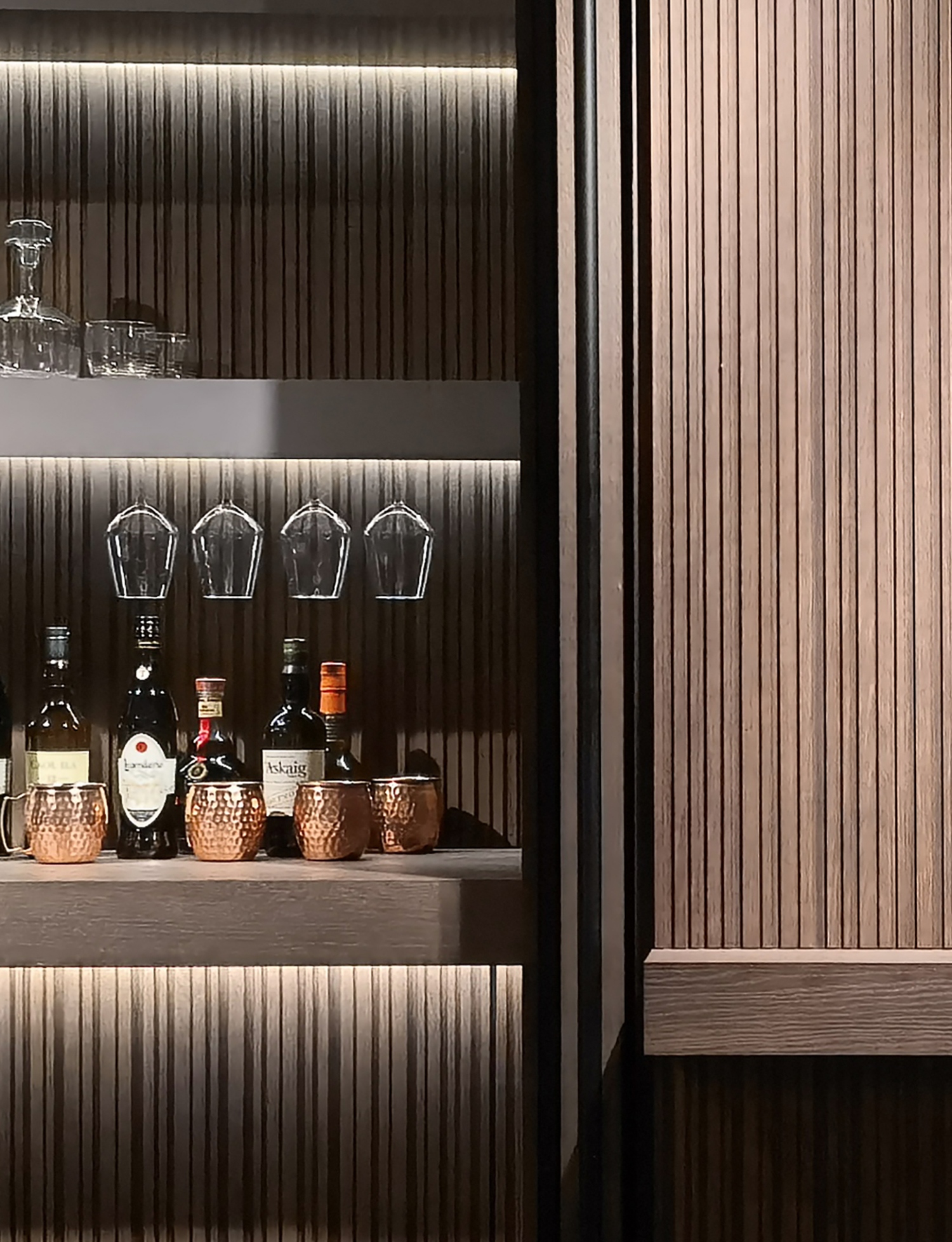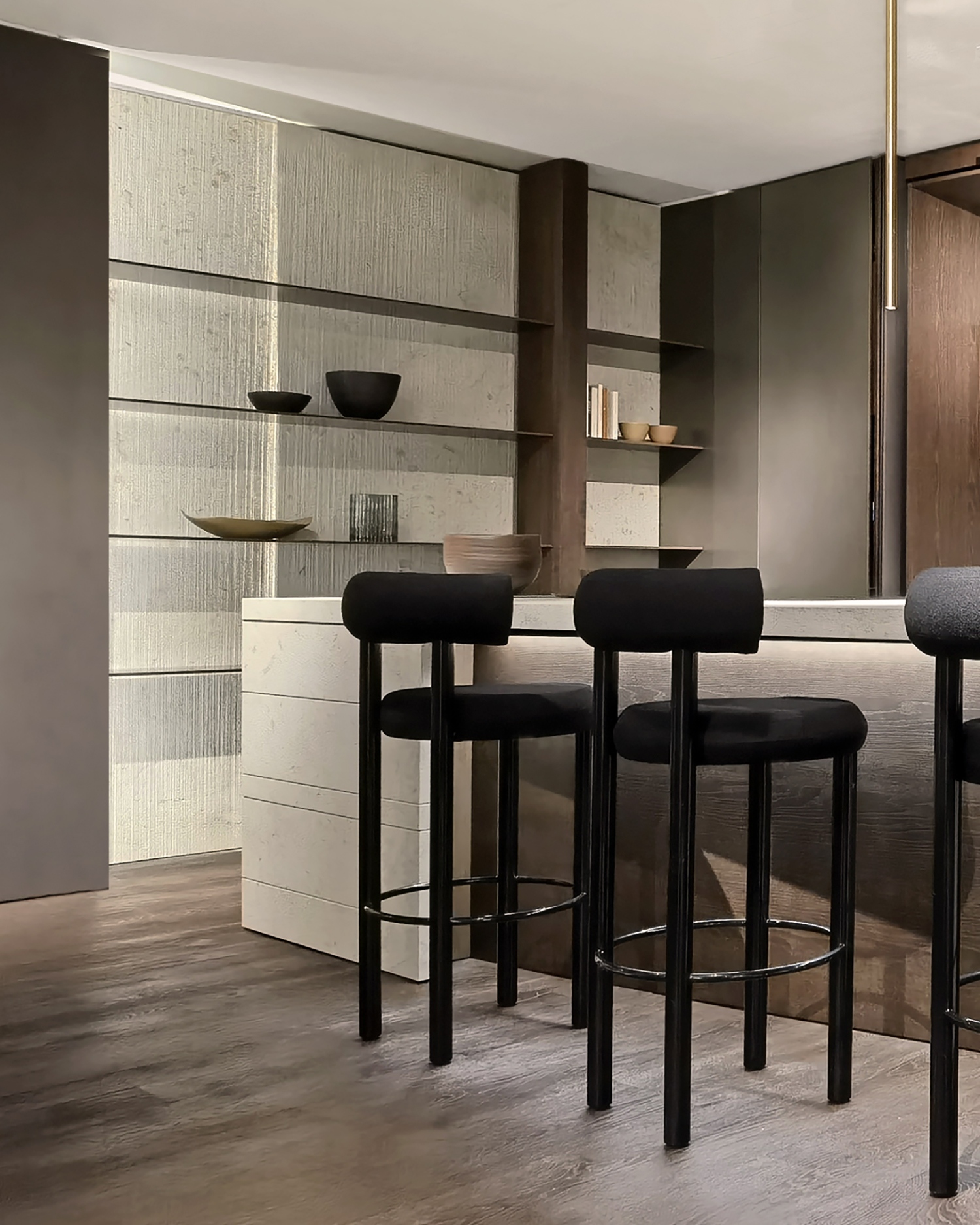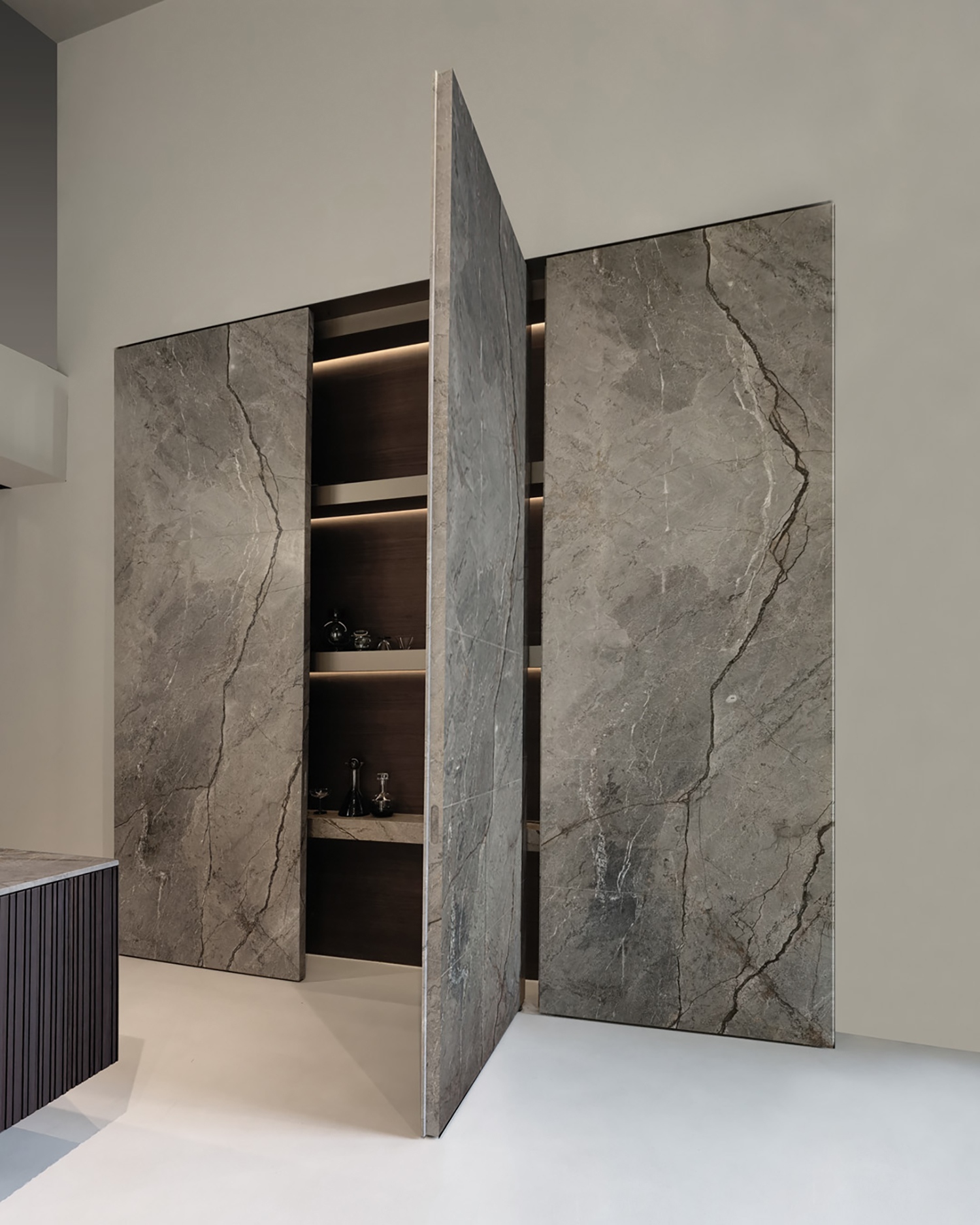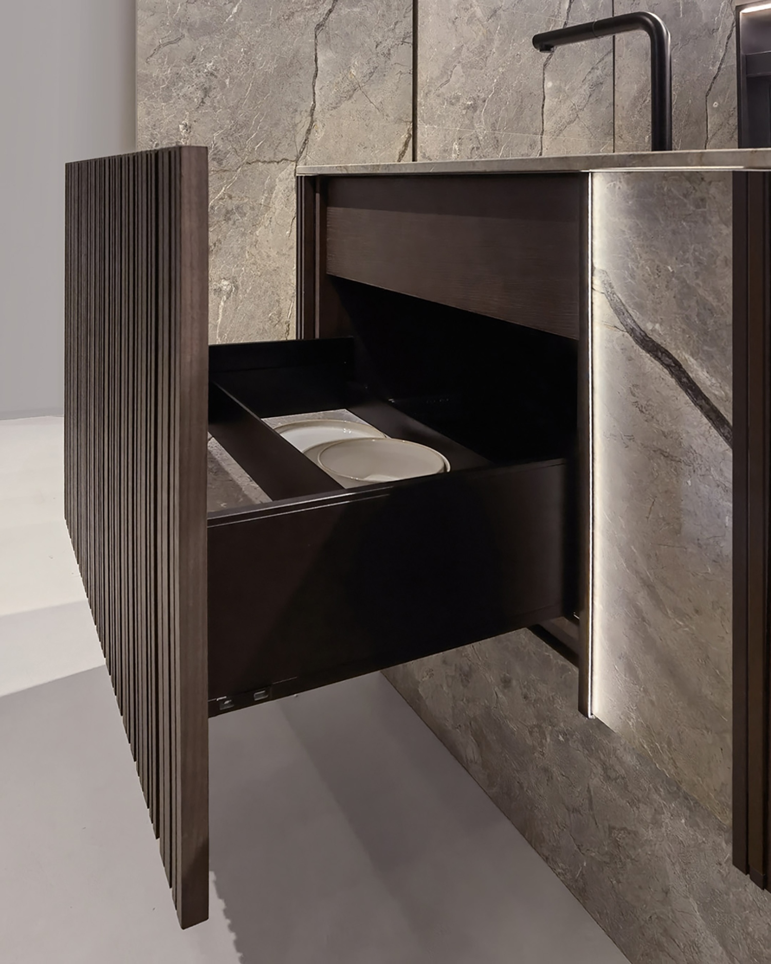 Ez az újítás nemcsak technológiai bravúr, de esztétikai szempontból is példaértékű. A mosogatógépet rejtő ajtó teljesen beleolvad a kőhatású sziget alsó részébe, köszönhetően a gondosan megtervezett burkolatnak és a Moka diófából készült, barázdált felületű Groove-program részeként megalkotott ajtónak. A finoman mart minta vizuálisan tágítja a teret, miközben modern, letisztult megjelenést biztosít.