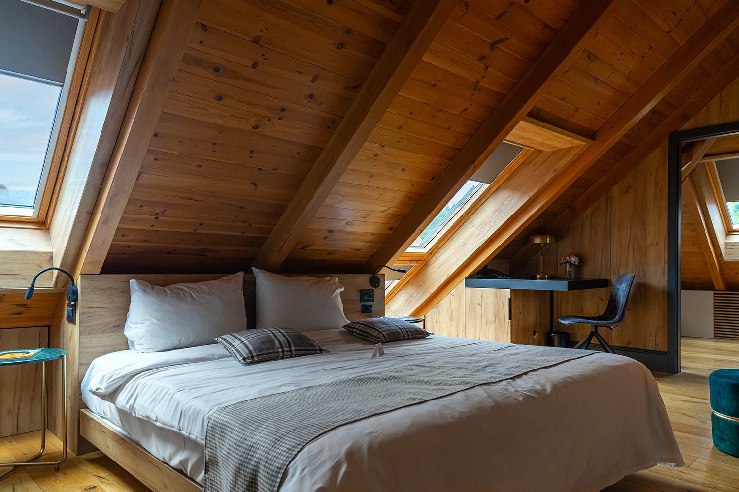 A kényelem egyik meghatározó eleme a természetes fény, amely nemcsak a térérzetet növeli, hanem jelentősen hozzájárul a vendégek jó közérzetéhez is. A panzió robusztus, mégis elegáns építészeti kialakítása lehetőséget teremtett a VELUX tetőtéri ablakok és tetőerkélyek beépítésére. Ezek nemcsak bőséges napfénnyel árasztják el a szobákat, hanem lenyűgöző kilátást is kínálnak. Amikor pedig a vendégek egy kis nyugalomra vagy sötétebb környezetre vágynak a nap folyamán, a VELUX fényzáró rolók biztosítják a kívánt árnyékolást – tökéletesen illeszkedve a tetőtéri ablakokhoz és az tetőerkélyekhez egyaránt.