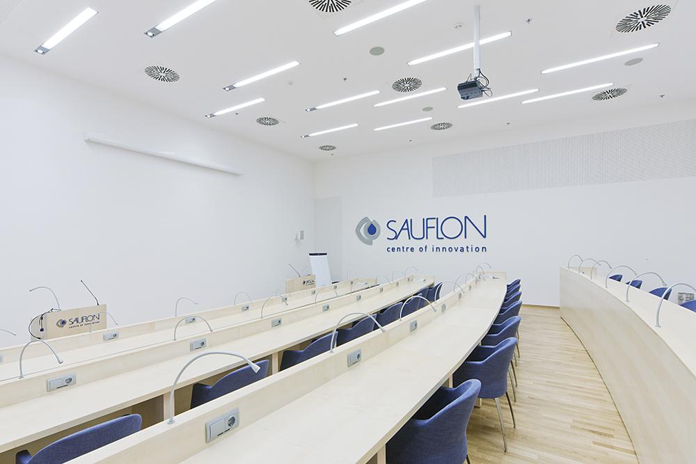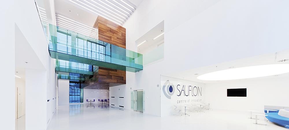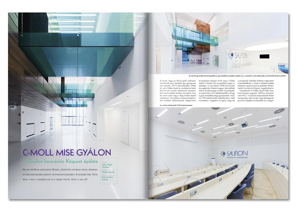 Ki hinné, hogy az M5-ös gyáli szakaszánál elterülõ ipari épületek egy gyöngyszemet rejtenek. 2013 decemberében adták át, azt a Földes László és munkatársai készítette tervek nyomán létrehozott reprezentatív teret amelyet Sauflon Innovation Center néven ismer meg a világ minden tájáról ideérkezõ, kontaktlencse-kereskedelemben érdekelt vállalatvezetõ. Meghívásos tervpályázat alapján bízta meg a Földes stúdiót a Sauflon brit anyavállalat angol vezetõsége. A csarnokban 2008 óta kontaktlencsegyártást folytató magyar leányvállalat sikeres tevékenysége további terjeszkedésre ösztönözte a brit vállalatvezetõket. Ahogy a gyár termelékenysége gyarapodott, immáron 700 alkalmazottat foglalkoztatva, több mûszakban, megjelent az igény, hogy ezt a prosperáló mûködést érdemes megmutatni a kereskedõknek is. Ezzel a célzattal született pályázat a gyárral azonos épületben létrehozandó Innovációs Központ megalkotására.