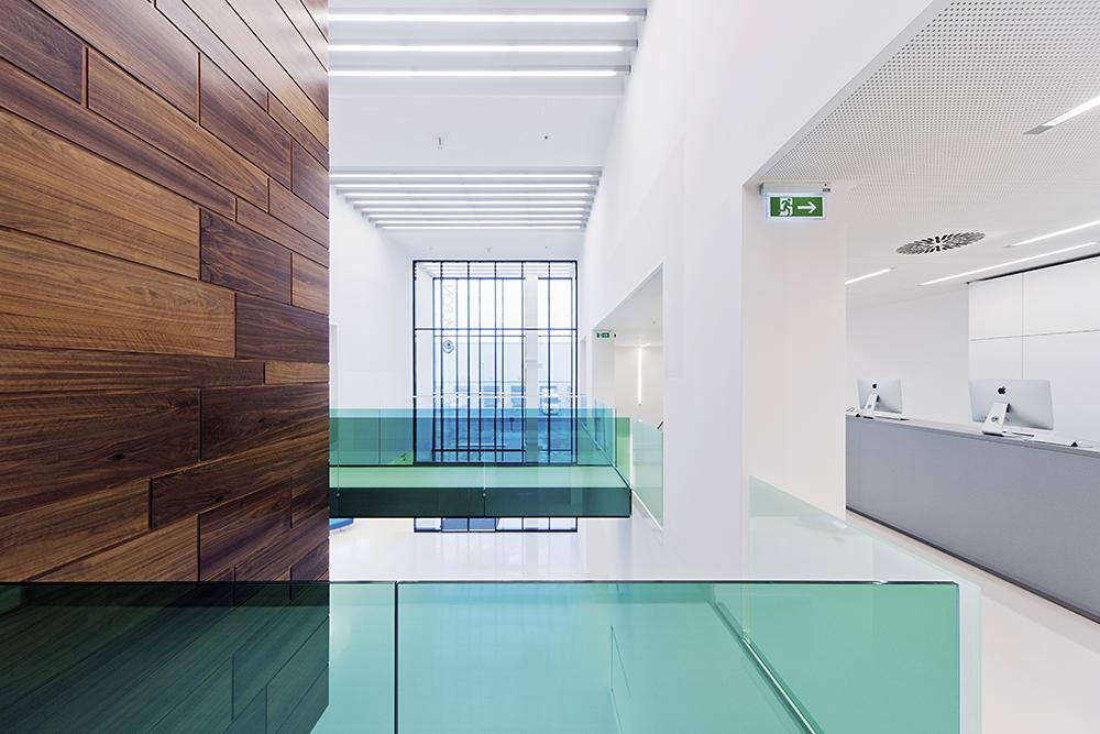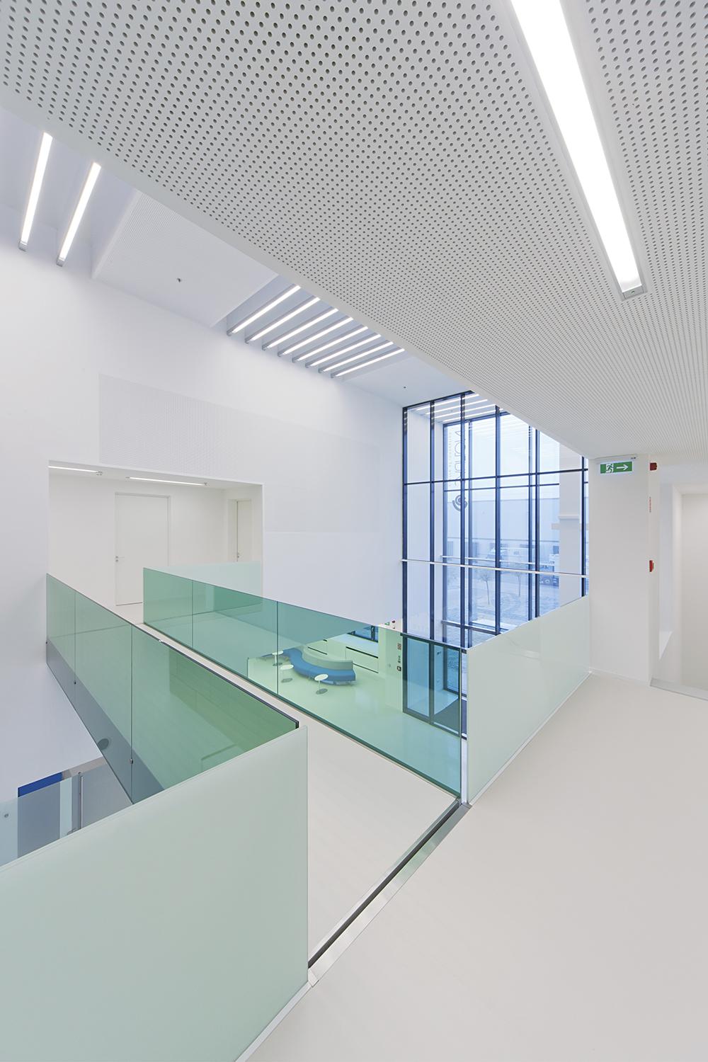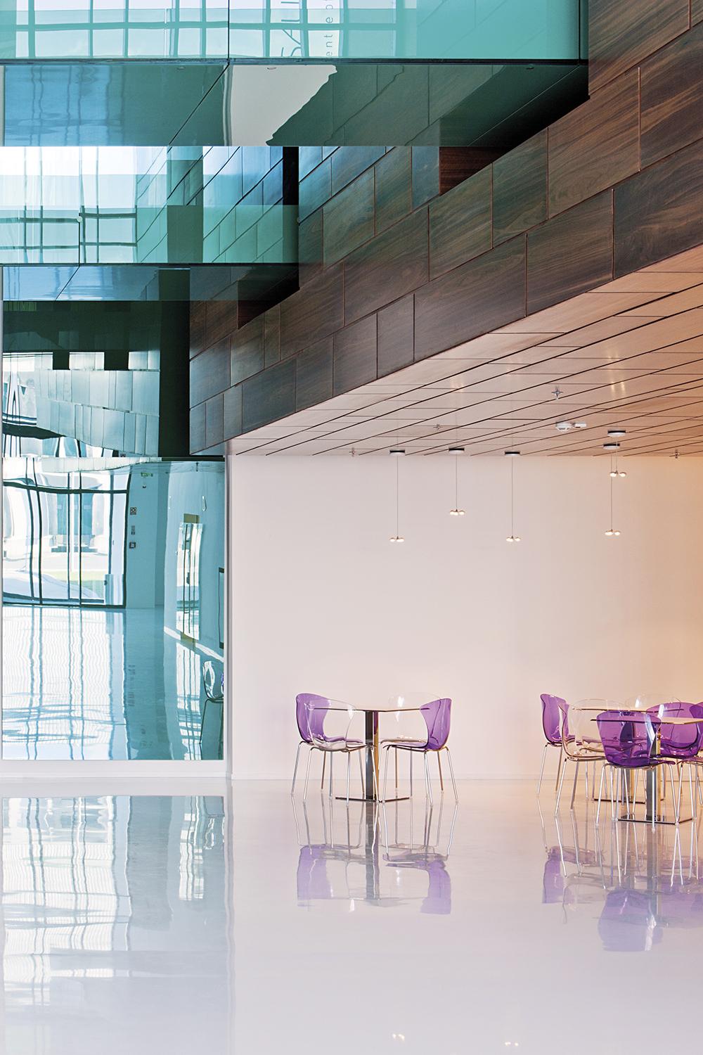 Visszaköszön itt Földes László Pethõ Lászlóval közösen jegyzett, 2002-es pilisszentiváni W.E.T. innovációs központjának térbeli koncepciója, ahol szintén nagy belmagasságú átrium fogadja az érkezõket, és a tárgyaló, illetve egyéb terek ennek oldalán kaptak helyet, hidakról elérhetõen. Ugyanígy hozzátartozik az elõképekhez a Földes stúdió által tervezett – az Octogon magazinban címlapon is szerepelt – Vulkánház (OCTOGON 2013/3), ahol az egyes kiállítóterek az öt emelet magasságban megnyitott átrium különbözõ oldalain „lebegnek”, dobozokba zárva. A gyáli innovációs központ esetében azonban a korábbi munkákon túlmutató eredmény született, Rohe-i értelemben mindenképp. Maga a téma ihlette ugyanis a tervezõket arra, hogy a kontaktlencsérõl kialakult képet enteriõrré fogalmazzák.