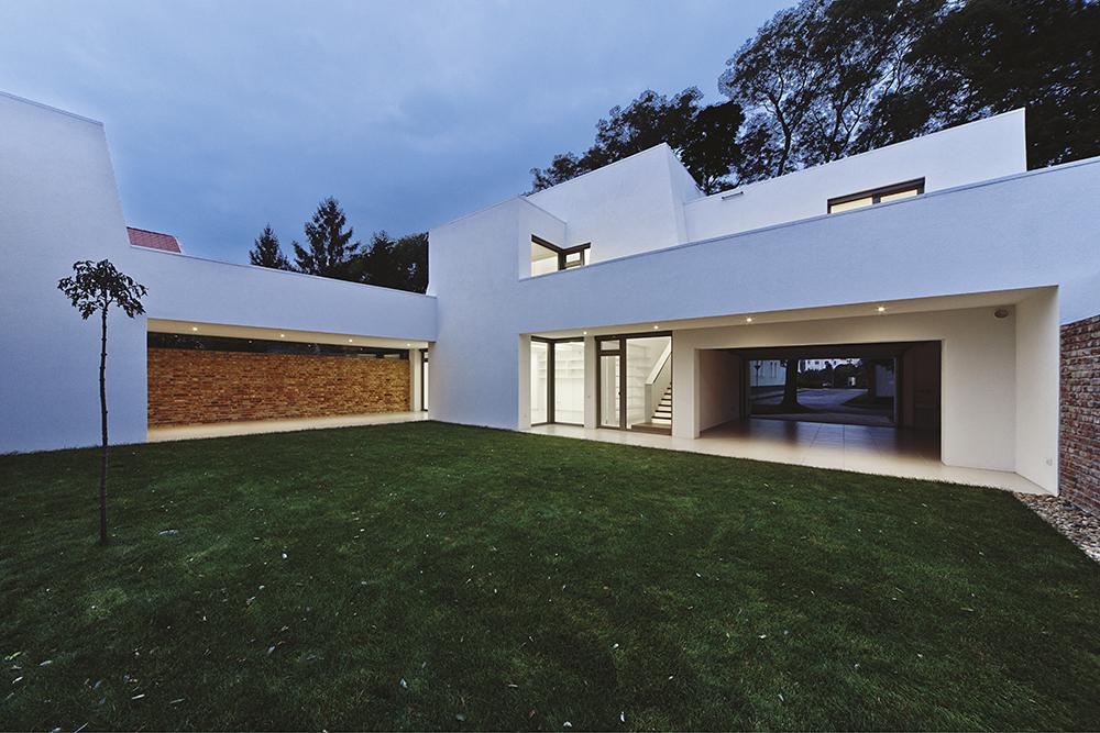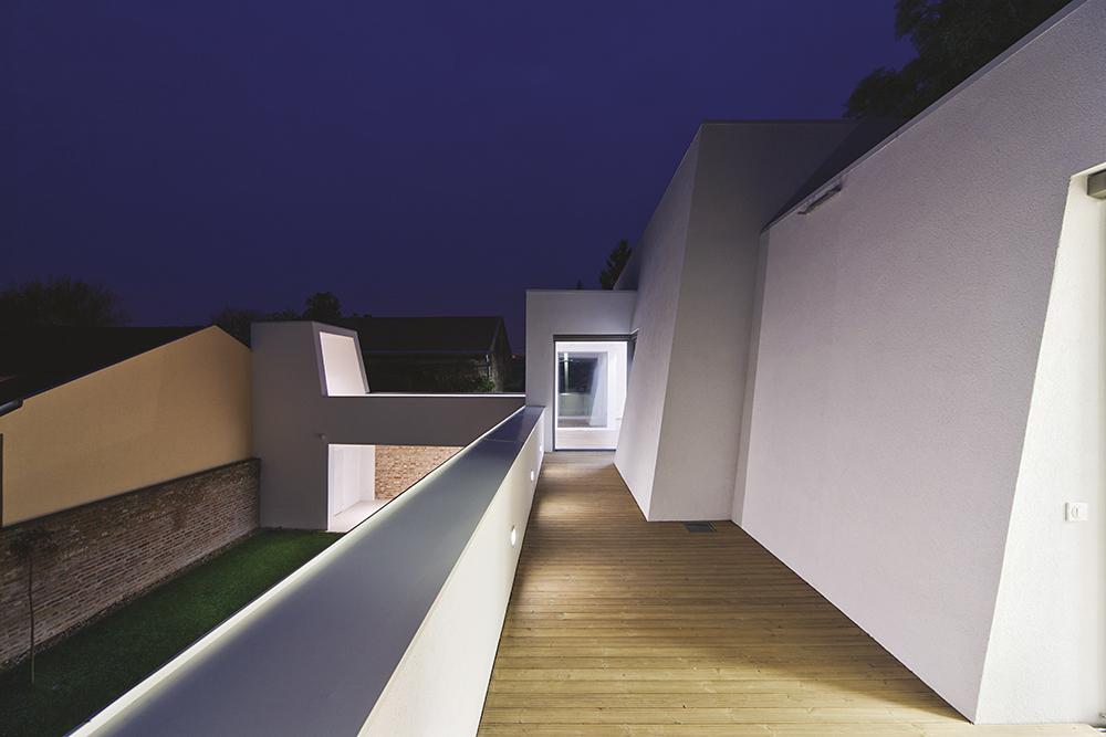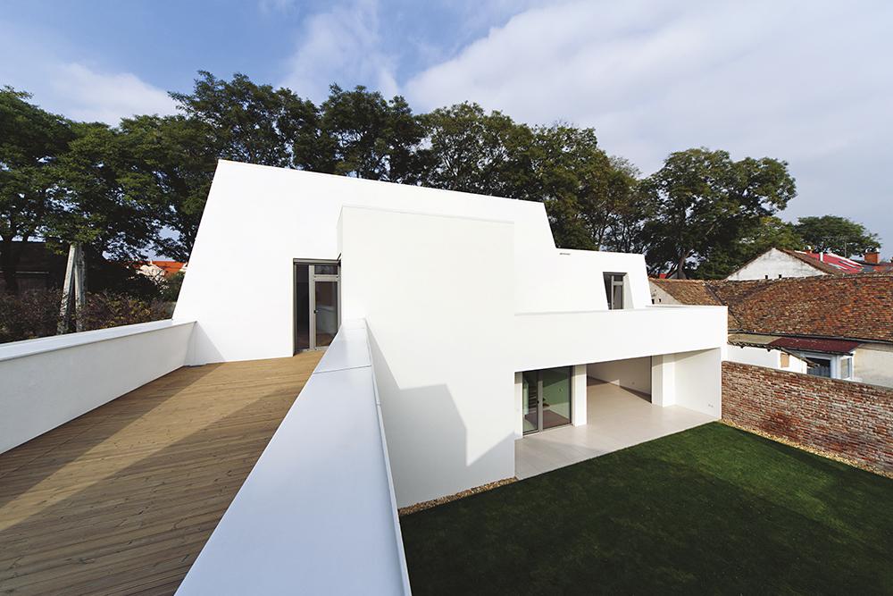 Így a karakteres sarokház, aminek belső teraszairól, kertjéből szinte tüdőnkbe szívhatjuk a környező öreg házak mállott húsának, mohos cserepeinek párálló múltját, egyfajta házformájú szoborrá lényegül át. Tiszta, hófehér belső tereiben járva az építészeti mesterség birodalmába, belső rétegeibe kapunk beavatást. Kovács Péter tökéletes, lírai formában beszél mindarról, amit az építészet kapcsán mondani lehet.
