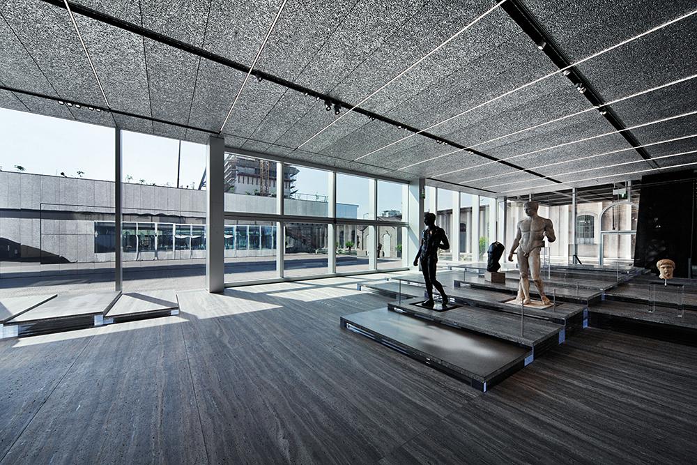 Nyilván mindenki számára az időszaki kiállítás pavilonjának külső-belső fémhab burkolata lesz a legemlékezetesebb. Ennek az épületrésznek a két emeletén jelenleg a Serial Classic kiállítás látható, amit Salvatore Settis és Anna Anguissola kurált , és ami az antikvitás és reneszánsz szobrászat másolat-másolás kultuszával foglalkozik. Habosított fémet, konkrétan habosított alumíniumot mintegy tíz éve fogtam először a kezemben, mert a miskolci műszaki egyetem dolgozott a technológián. Így száz meg száz négyzetméteren, burkolatként felhasználva úgy, hogy márványpadlóval találkozik, még nagyobb élmény volt. A fémhab rendkívüli tulajdonsága, hogy az apró buborékok szövedékében nincs egymásra hasonlító egyetlen négyzetcentiméter sem. Ráadásul a viszonylag egyöntetű felszínhez közelebb-közelebb lépve bomlik csak ezer részletre, ezer kis „mikro-barlangra” a felület. Mint egy fraktál, úgy szippantja az embert be a látvány, míg ha újra távolodunk tőle, akkor a részletek kisimulnak, a kép összeáll.