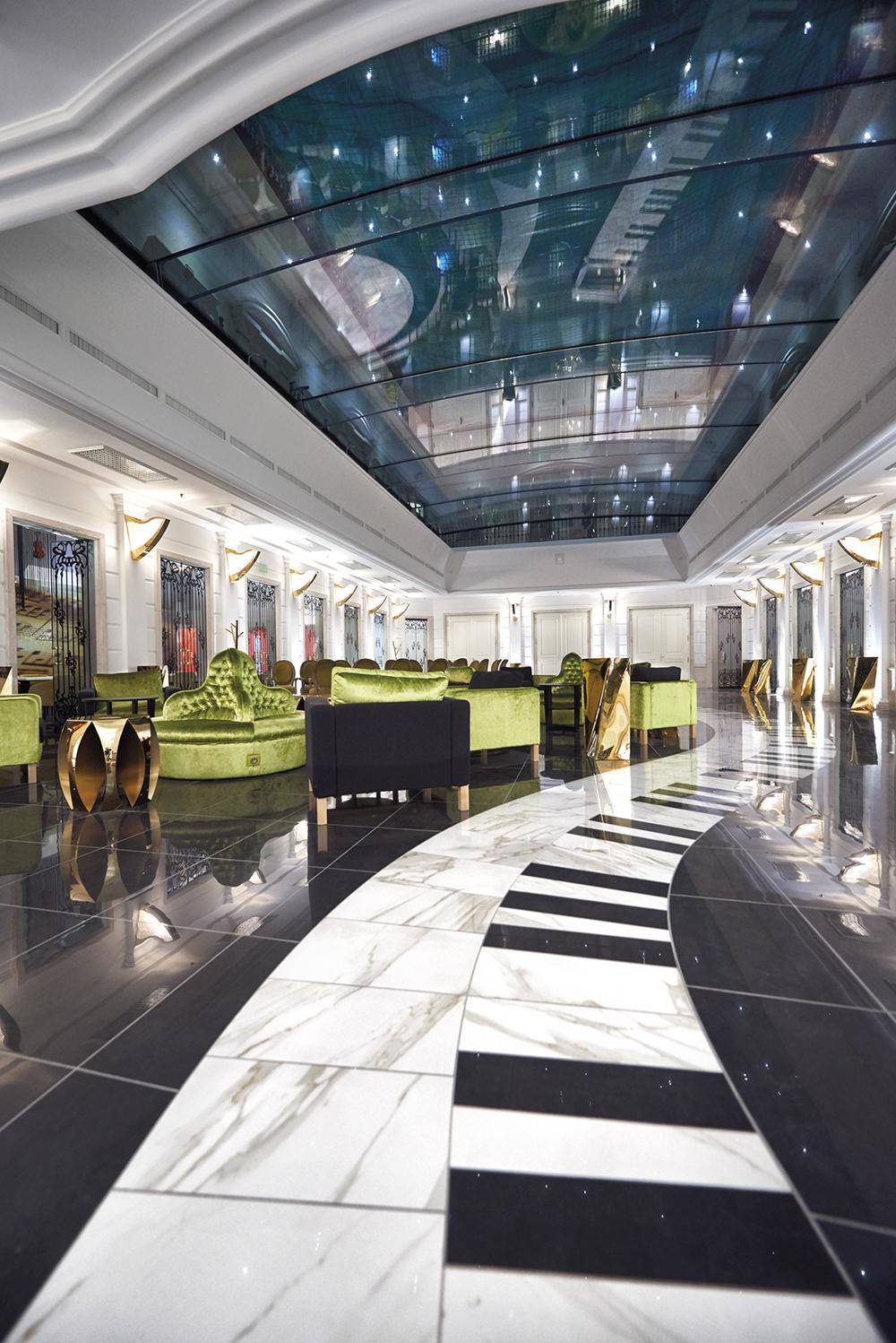 A tulajdonos a zenei témájú exkluzív belső terek megtervezésére Varró Zoltánt (VARRODESIGN) kérte fel, 2009 óta tart a közös projekt (tervezés: 2009-2012). Amerikai divat szerint a hotelbe bárki betérhet enni-inni-szórakozni. A földszint egy különböző hangulatú részekre tagolt, ám funkcióját tekintve egységes közösségi tér, a szolid recepciót oldalt rejtették el. A Marilyn bár az 1950-es, ’60-as évek hollywoodi érzetével igazi női budoár, tükörmozaikkal kirakott íves mennyezete akár egy óriási lámpabura. A falburkolat pikáns kékje a színésznő kedvenc színe volt. A nőies pólussal szemközt található a férfias Satchmo (Louis Armstrong) könyvtárszoba. A Stradivari étteremben csobogó vízfal jeleníti meg a zene hullámzását.