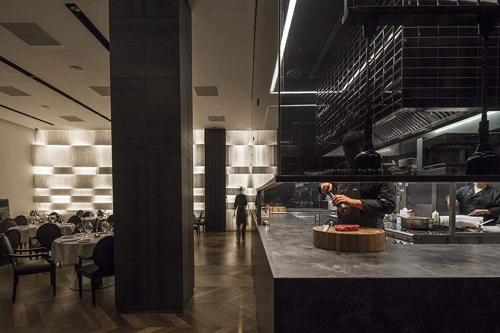 Védett pozícióba helyezett, lágy megvilágítású fogyasztótér a vacsora felszolgálásának színtere. Fónagy Dóra design-stratégiájának kulcsfontosságú eleme a fogások készítőinek és vendégeiknek a találkozása, így került fókuszba a tálra kerülő étel átadásának gesztusa. Ezt az üzenetet a konyha szürke üveg-kubusába vágott, intenzíven világított át-adóablak húzza alá. A közlekedőben többfunkciós pult segíti a felszolgálók munkáját. A szemközti fal teljes felületét kitölti a MOLO hullámzó papírinstallációja, amely ilyen léptékben alkalmazva építészeti struktúrává válik. Plasztikus, mégis megfoghatatlan, derengő fényeivel megidézi a szomszédos Dorottya-palota reprezentatív belső udvarát. A konyha üvegfalára reagálnak a vele szemben elhelyezett hatalmas tükrök, egyben gazdag reflexiókat teremtve.