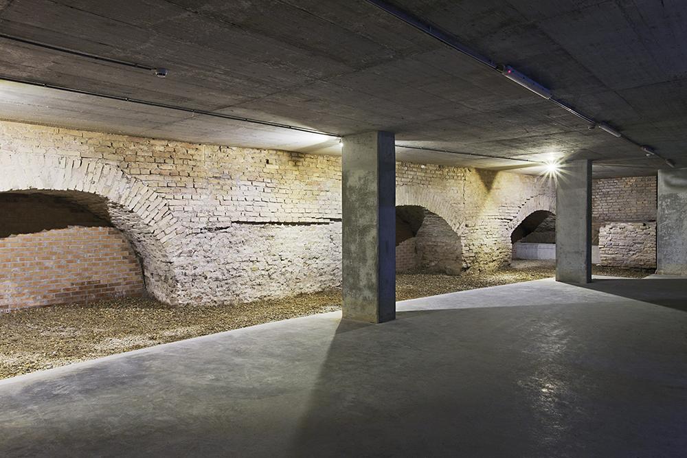 Belső terei befejező designja még várat magára, egész pontosan a bérlők feladata lesz. Néhány földszinti és az első szinti térben megmaradtak a 18. századi – tartószerkezeti szempontból menthetetlen, így – jórészt lebontásra ítélt Brády-ház részei (egy-egy boltozott szoba), valamint az eredetivel megegyező tetőgerendázatát is visszaépítették az emeleti szinten. E ház fizikailag is kapcsolatban áll a mélygarázzsal: földszintjéről, az alagsoron át a háromszintes mélygarázs első szintje (-1) érhető el – ez az a garázsszint, ahol a téren folyó színházi, zenei előadások szereplőinek, résztvevőinek öltőzői is helyet kaptak. De ezen a garázsszinten látható egy üvegfalon át a régi városfal néhány méter hosszú, ívsorokkal tagolt téglafal-részlete is, megőrizve itt, a föld alatt egy darabot Győr múltjából.