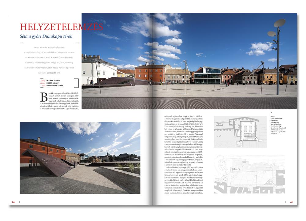 Barokk mennyezeti freskókra illő felhőcsodák úsztak lassan a megújult tér felett azon a vasárnapon, amikor ellátogattunk a helyszínre. Bámészkodók, a párbeszédekből ítélve főként győriek, de külföldiek is sétáltak a téren, sok gyerek vette birtokba a helyszínt, visongva hajtották a zajos futóbicikli, örömmel tapasztalva, hogy az északi oldalról, a Móricz Zsigmond rakpart felől indulva délnek elég egy kis lendület és lám, magától gurul a gép, szinte egészen az új ún. delikáteszház (sokszor így: Delicatesse) főbejáratáig. Néhány éve lehetetlen lett volna ez a bravúr, a Mosoni-Duna partjáig csak mostantól járható be kizárólag gyalogszerrel ez a terület, az átalakítás előtt a Móricz Zsigmond rakparton még autók pöfögtek, azaz a Dunakapu terét forgalom zárta el a vízparttól. A Google Earth felvétele, ha most pillantunk Győr városára, még a tereprendezés idejét mutatja, keleti oldalán egykorvolt házak alapfalainak szabályos rendszerével, valamint a régi várfalszakaszokkal. Ezek a rajzolatok visszaköszönnek a tér északi, partfelőli szakaszán kialakított szabálytalan alaprajzú, emelt virágágyások homlokoldalán, így a sétálók a betonfelület rajzain végigkövethetik, hogy a 16. századtól egészen napjainkig hogyan változott a környék utca-háztömb hálózata.