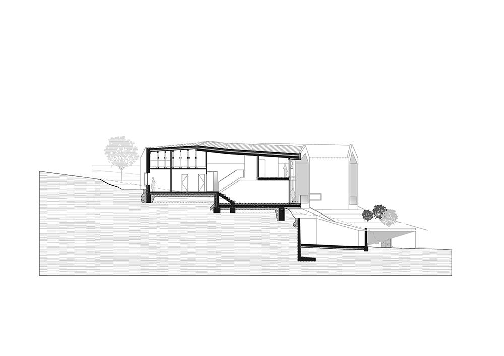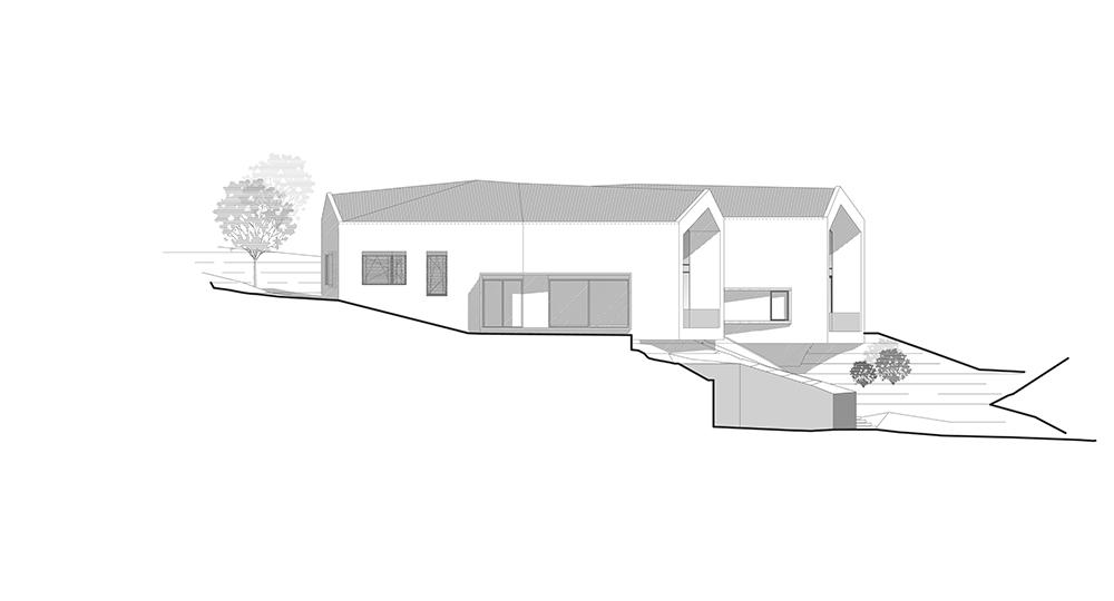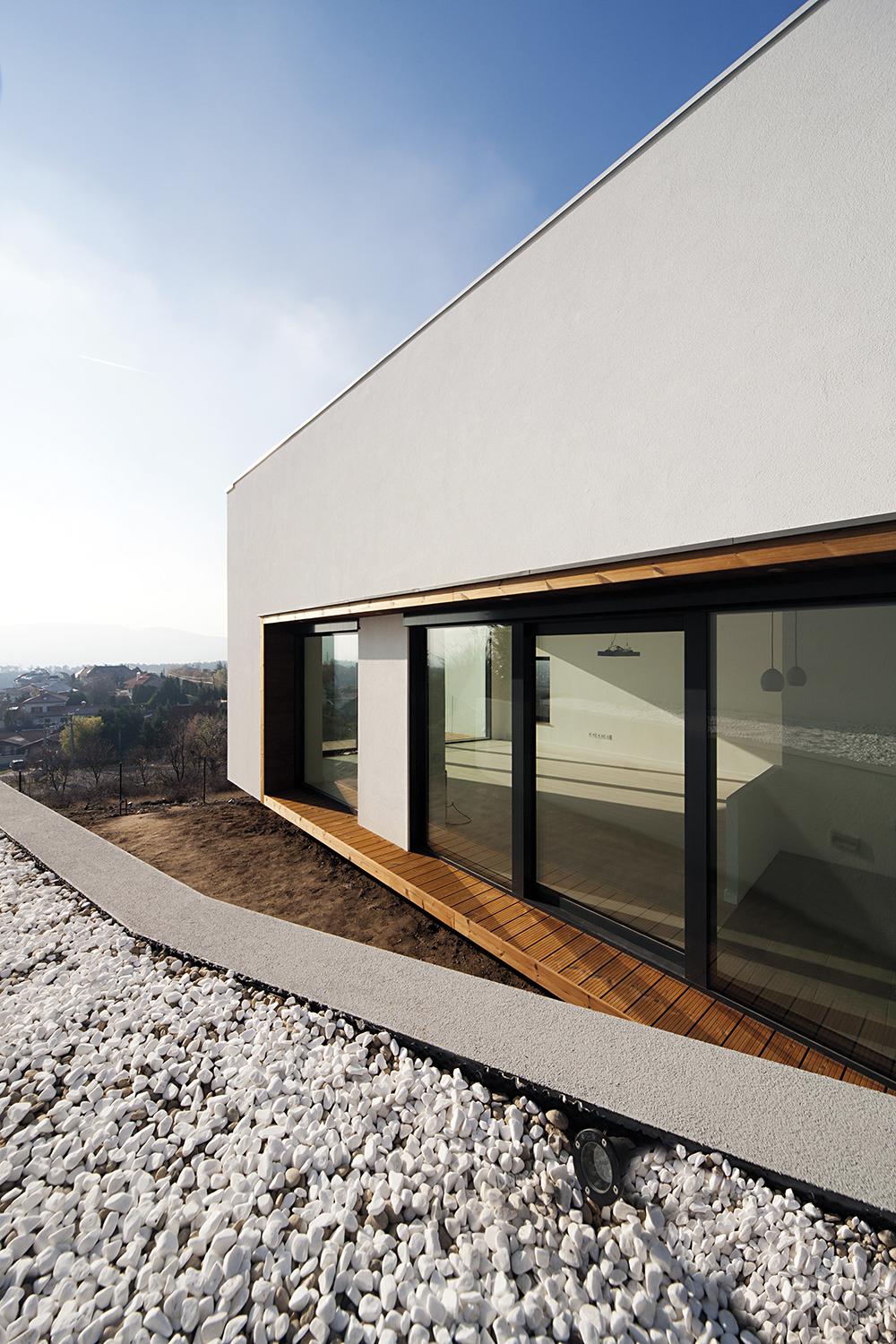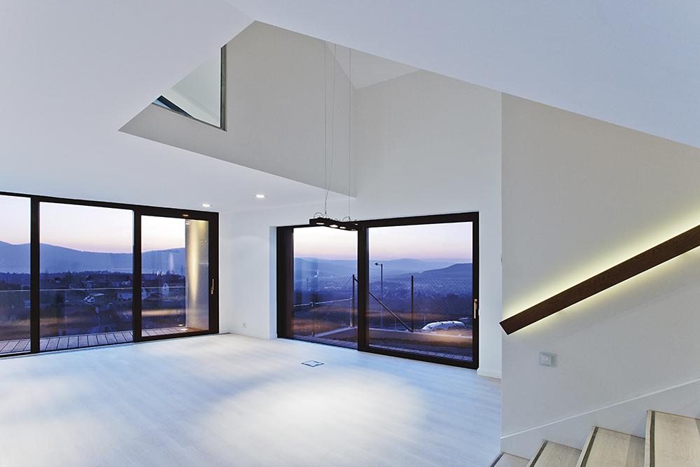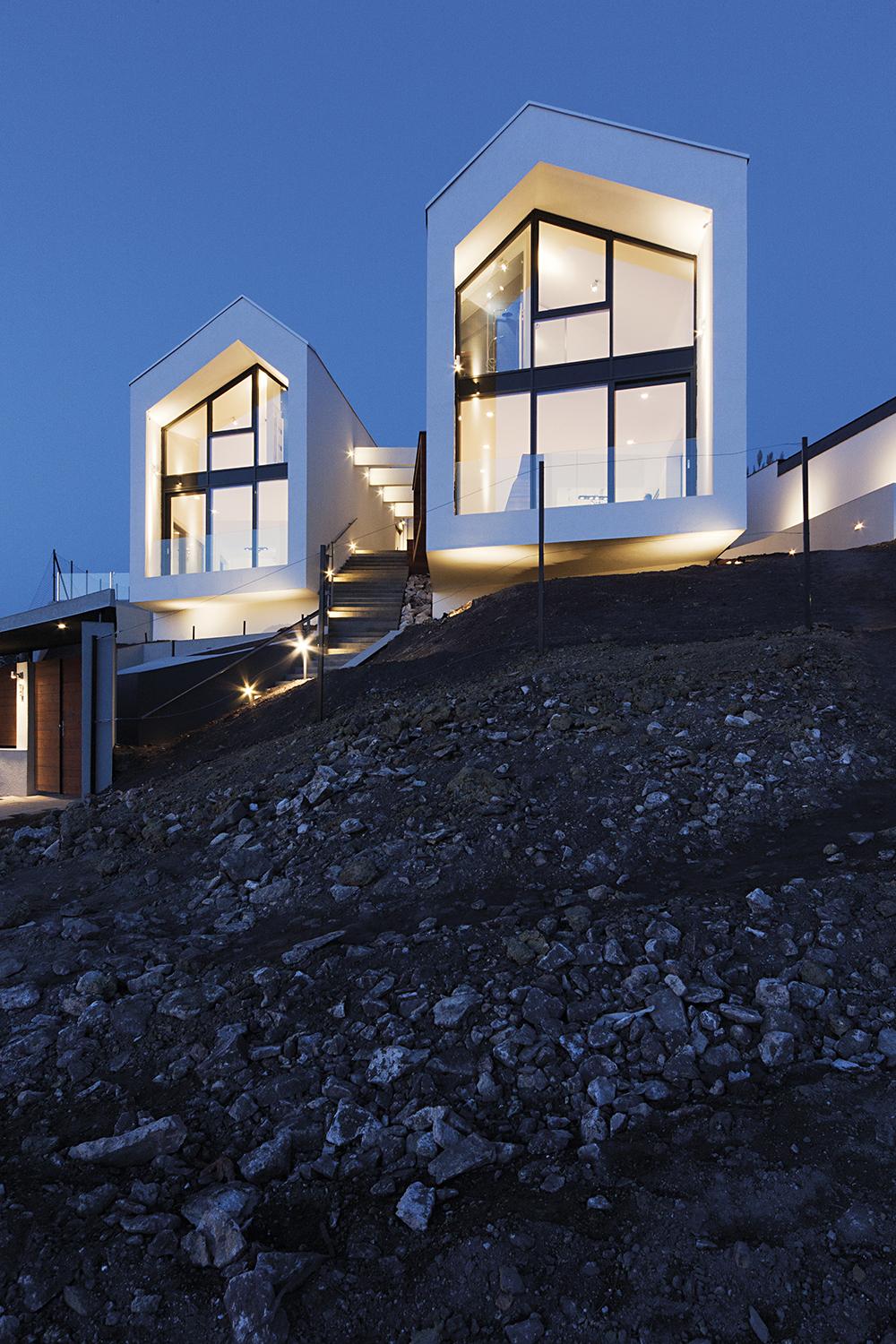 Arról beszélek, hogy létezik ennek a kétlakásos családi háznak egy pontosan elképzelt, megtervezett dramaturgiája, ahogyan a két ikerforma a hegy lábától érkezők tekintetét, szinte rabul ejti. Erős gesztus ez, amitől szabadulna az, aki valamiféle mélyebb összefüggésre vágyik. Ráadásul ez a meredek rézsűn, az ég és föld között lebegő két házorom szinte teljes felületén üvegfallal nyílik meg az érkezési irányba húzódó völgy, az út felé, ami tovább fokozza a látvány magnetikus erejét. Könnyen befogadható geometriai rendszer ez, ahol az éles kontúrvonalak egyfajta rajzosságot, grafikusságot is megjelenítenek.