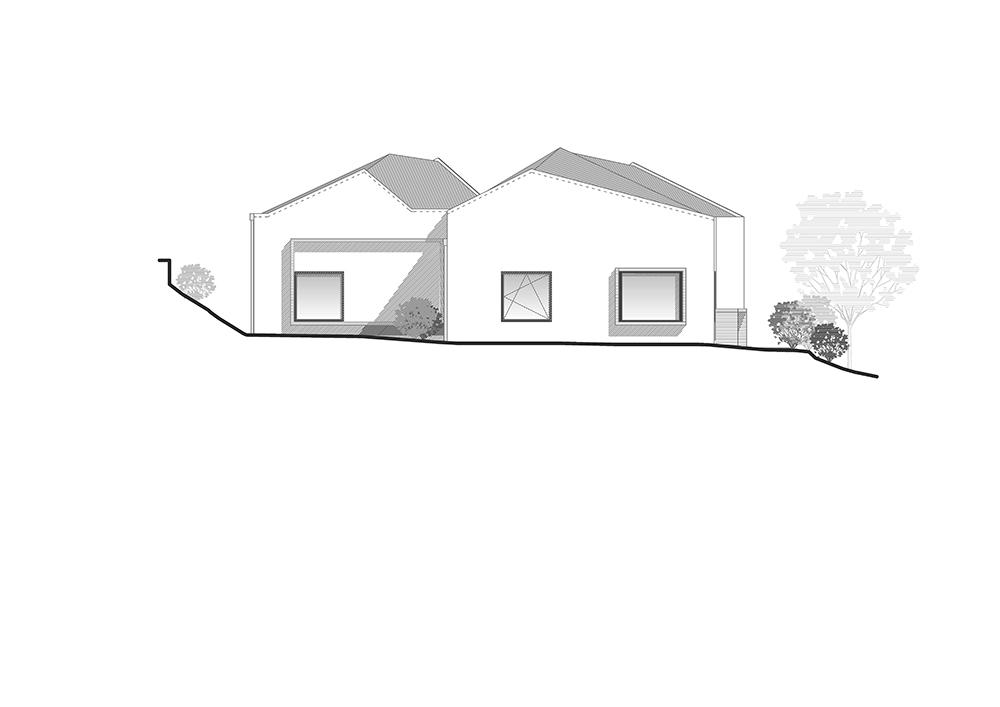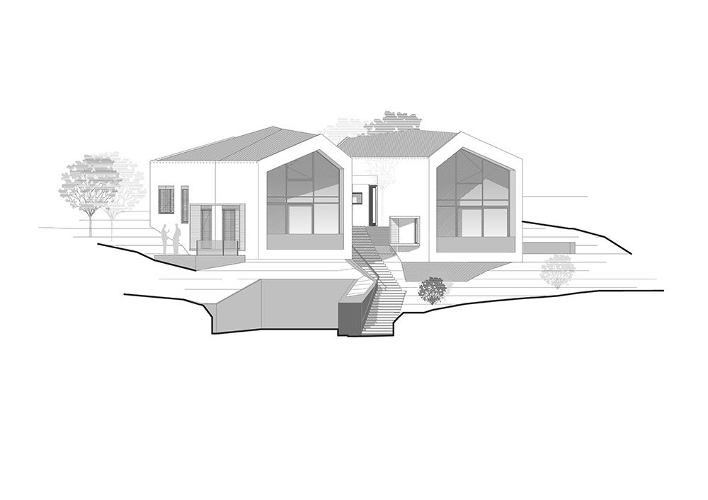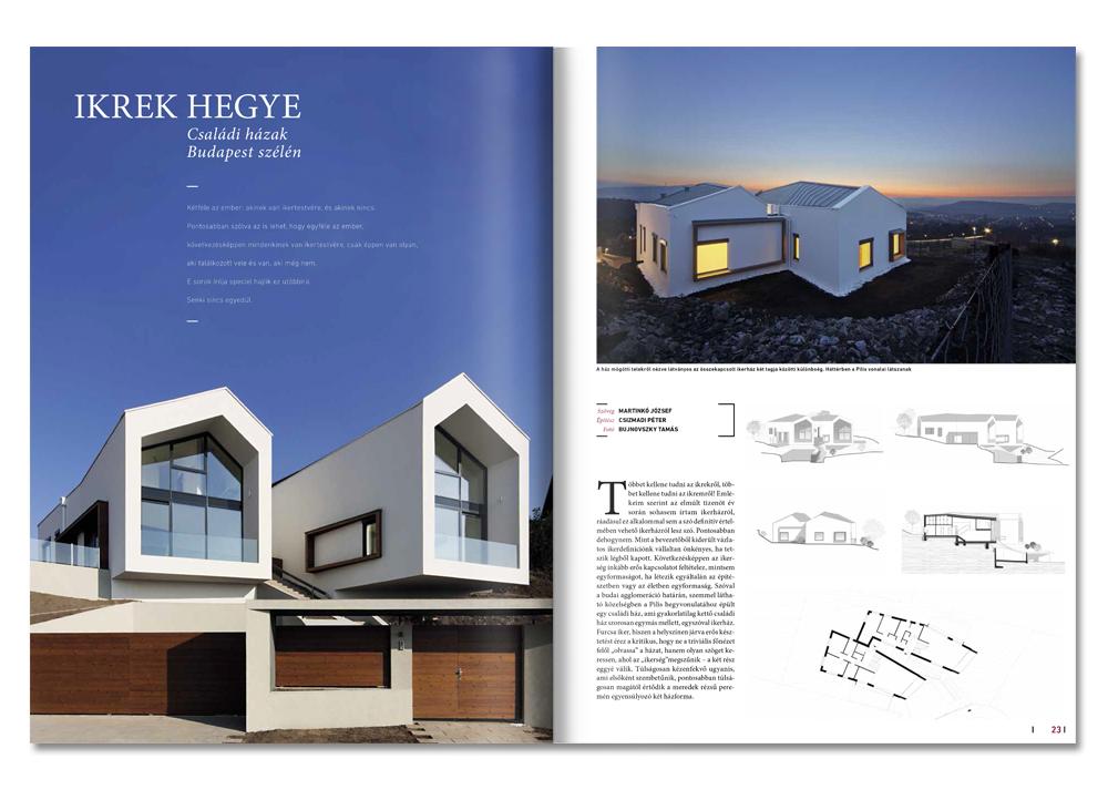 Szóval a budai agglomeráció határán, szemmel látható közelségben a Pilis hegyvonulatához épült egy családi ház, ami gyakorlatilag kettő családi ház szorosan egymás mellett, egyszóval ikerház. Furcsa iker, hiszen a helyszínen járva erős késztetést érez a kritikus, hogy ne a triviális főnézet felől „olvassa” a házat, hanem olyan szöget keressen, ahol az „ikerség” megszűnik – a két rész eggyé válik. Túlságosan kézenfekvő ugyanis, ami elsőként szembetűnik, pontosabban túlságosan magától értődik a meredek rézsű peremén egyensúlyozó két házforma.