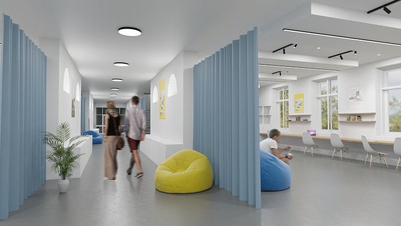 „Először is középfolyosót nyitunk, amelyekről osztályterek ágaznak le. Másodszor pedig egy kompakt tároló bútort hozunk létre, amely az osztályok közti elválasztás feladatát is ellátja. A szint végében lévő két zárt tanterem konzultációs térként hasznosul, az »üvegkalitkában« pedig átlátható és természetes fénnyel rendelkező makettezőt alakítunk ki. A duplex tér alatti területen egy közös, multifunkciós nappali tér jön létre, amit vertikálisan kettéválasztunk, egy szeparált galéria platformmal. A szint további részein az osztályterek kapnak helyet, amiket a függönnyel leválasztható középfolyosó kapcsol össze."