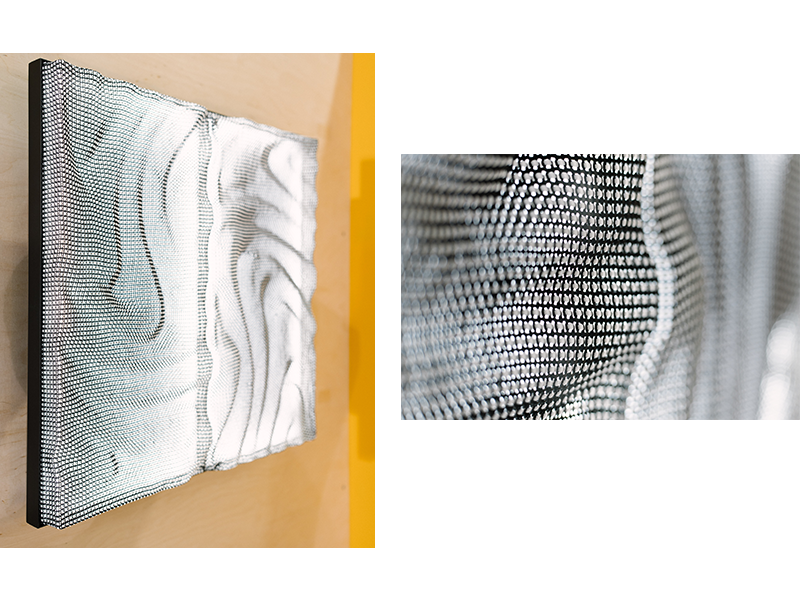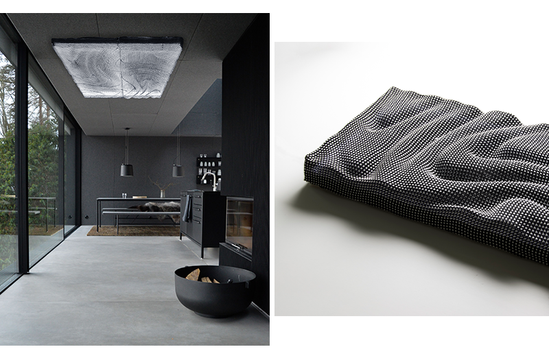 M.B.: Az elején moodboardokat készítettünk, és az onnan összegyűjtött inspirációk alapján fokozatosan alakult a koncepció. A tervezés egy meghatározó pontja volt, amikor a MOME anyagraktárában rábukkantunk egy izgalmas textilre, ami fényforrásnál szokatlan hatást keltett. Onnan a folyamat egy nagyon experimentális irányt vett, amit az azt megelőző inspirációk tovább lendítettek. A panelben megjelenő hullámfelületnek és a textil felhasználásának köszönhetően az egyedi fényhatás mellett kiváló akusztikai tulajdonságokkal is rendelkezik.