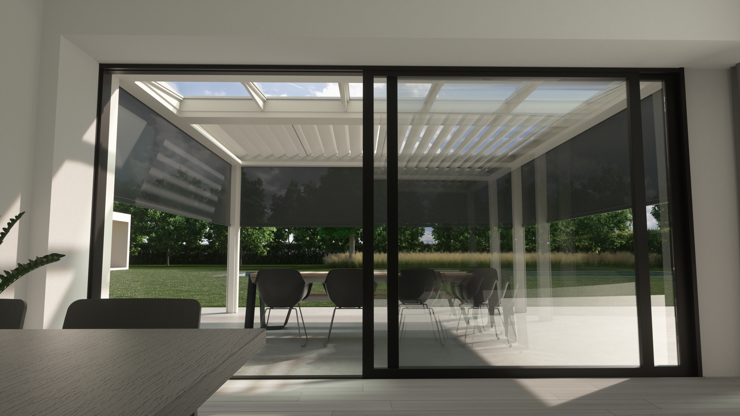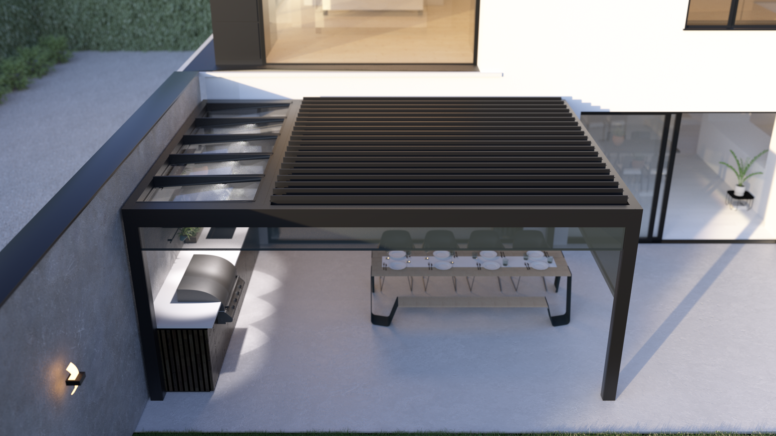 Üveggel vagy árnyékolókkal a pergola oldalai zárhatóak, belső tere télen temperálható és beépített LED világítással éjszaka is kellemes életteret biztosít.
