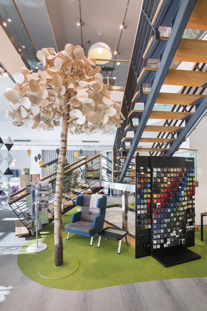 Skandináv erdő hangulatban született újjá a Kinnarps legújabb trendeket felvonultató bemutatóterme.