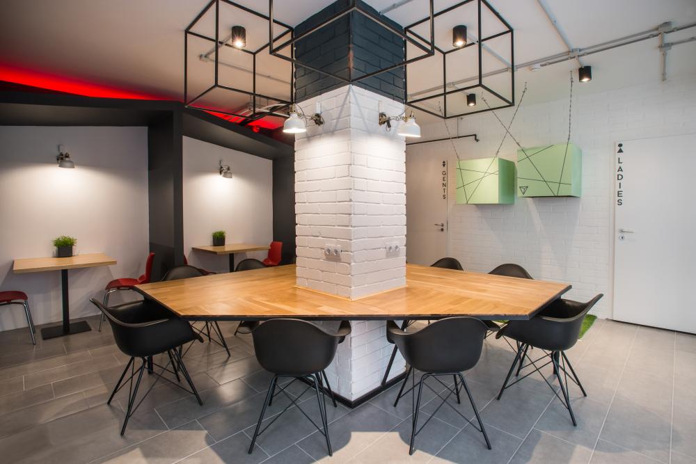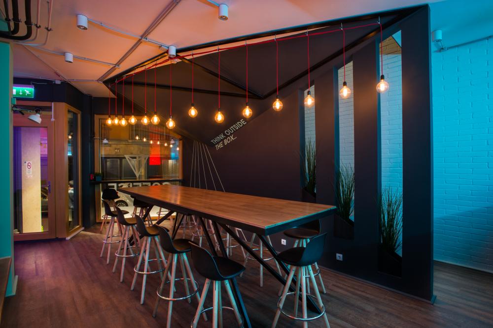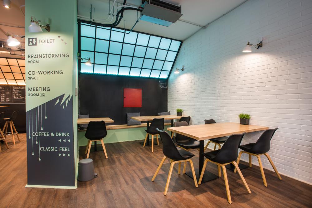 Kávézó, közösségi iroda és bár kombinálása ugyanazon térben.